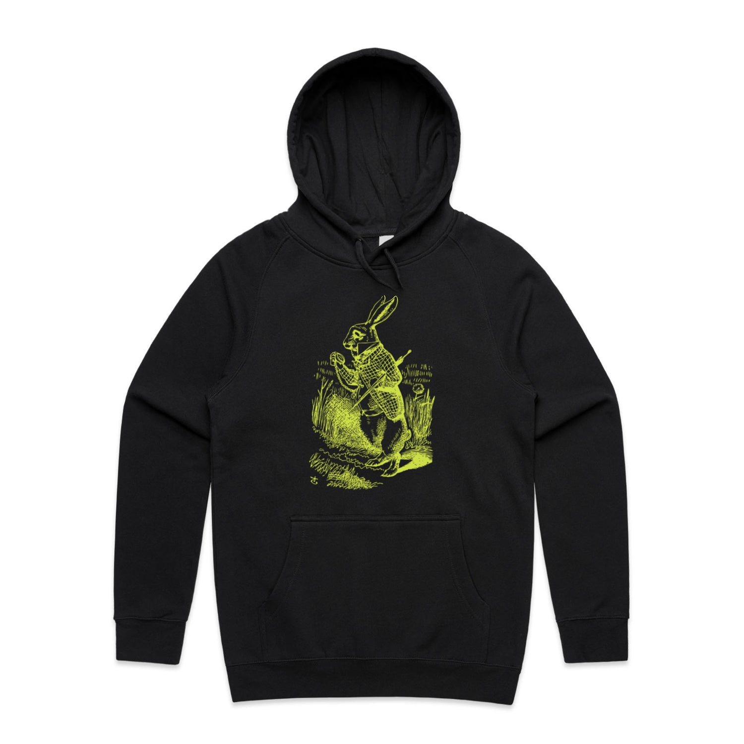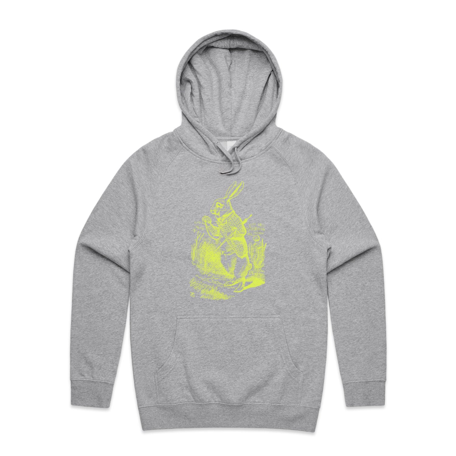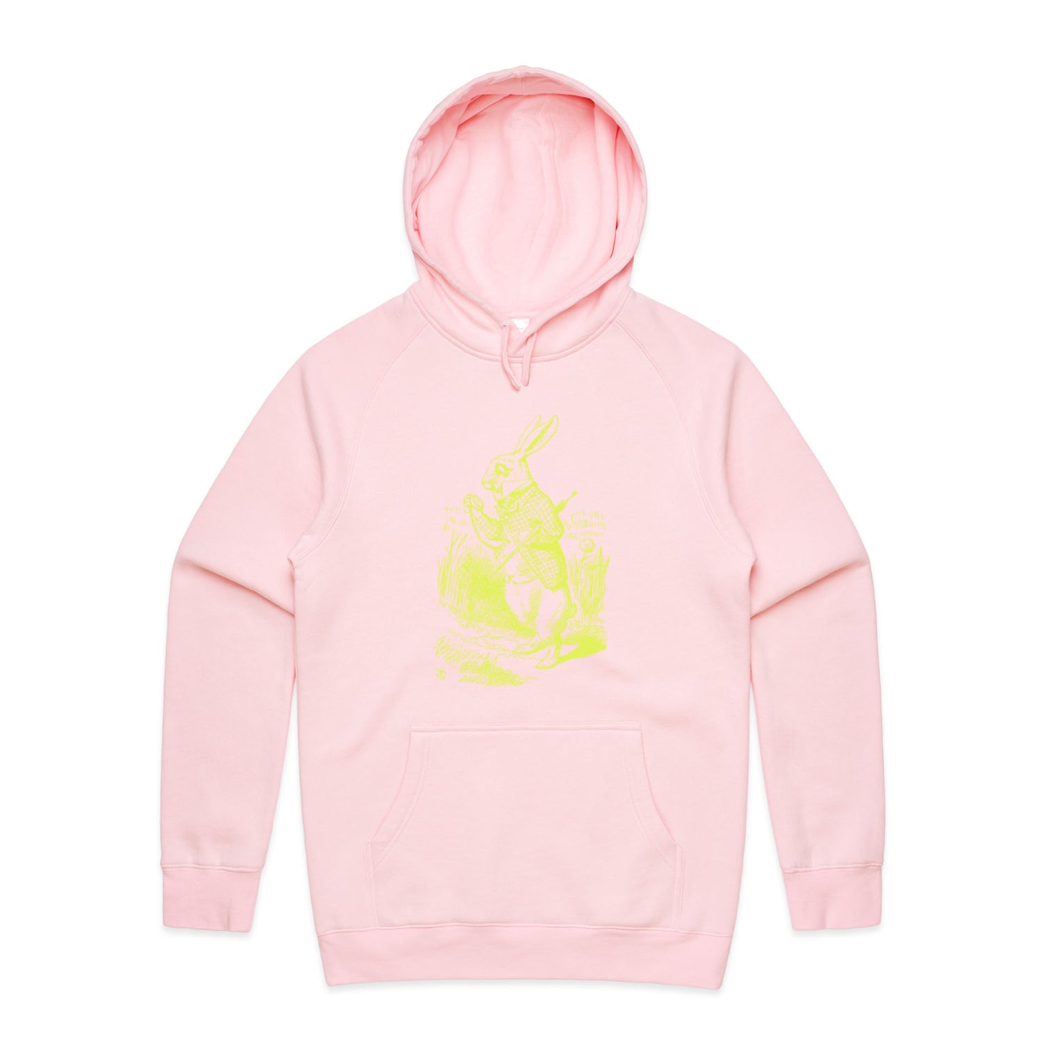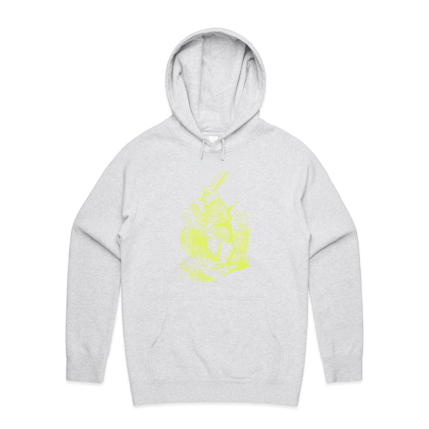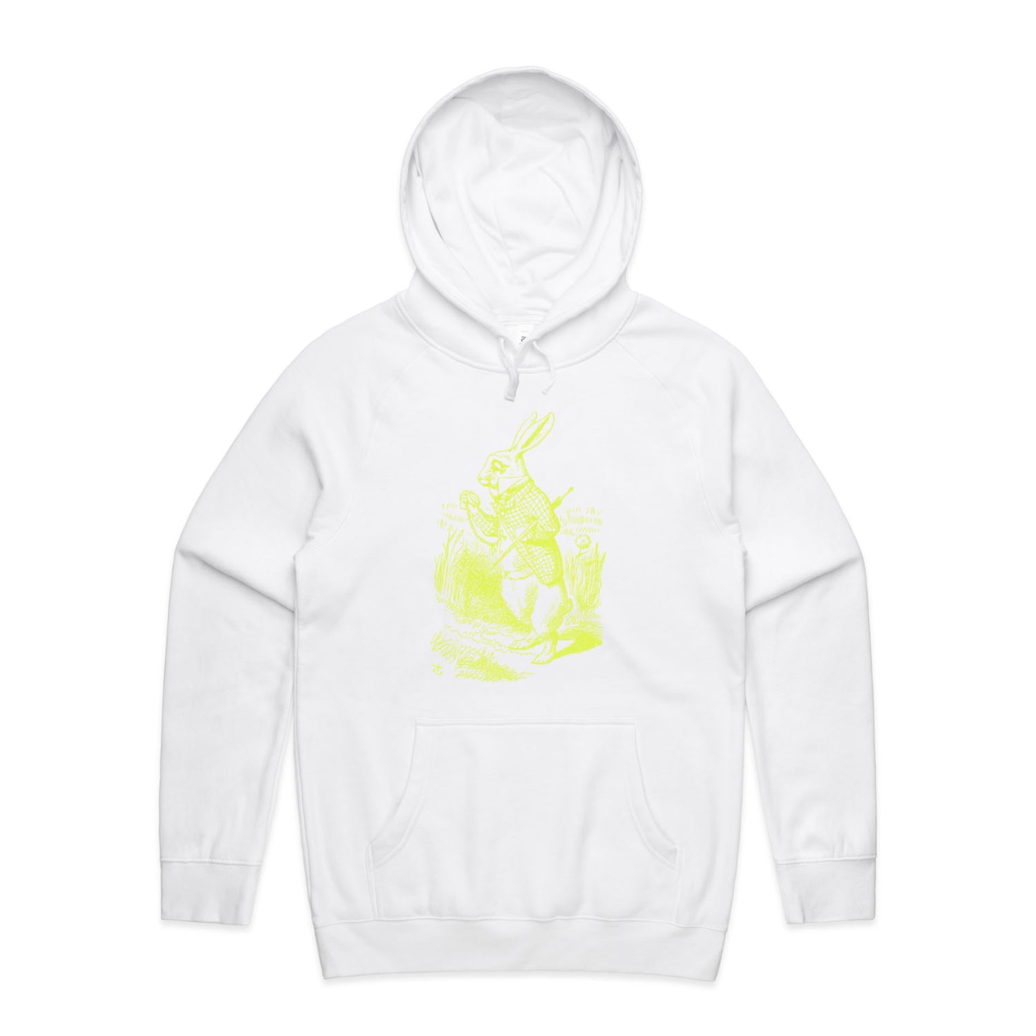 The Hoodies Alice in Wonderland - The White Rabbit – Men's Hooded Sweatshirt is a high-quality men's hooded sweatshirt, printed with fluoro yellow ink on the trusted AS Colour Supply Hood 5101. With a regular fit and mid-weight feel, it's crafted from a premium blend of 80% cotton and 20% polyester anti-pill fleece, making it a durable and comfortable staple for any wardrobe. The pullover design features raglan sleeves, a lined hood with tonal drawcord, ribbed sleeve cuffs, and a roomy kangaroo pocket — all designed to keep you warm while looking effortlessly sharp.