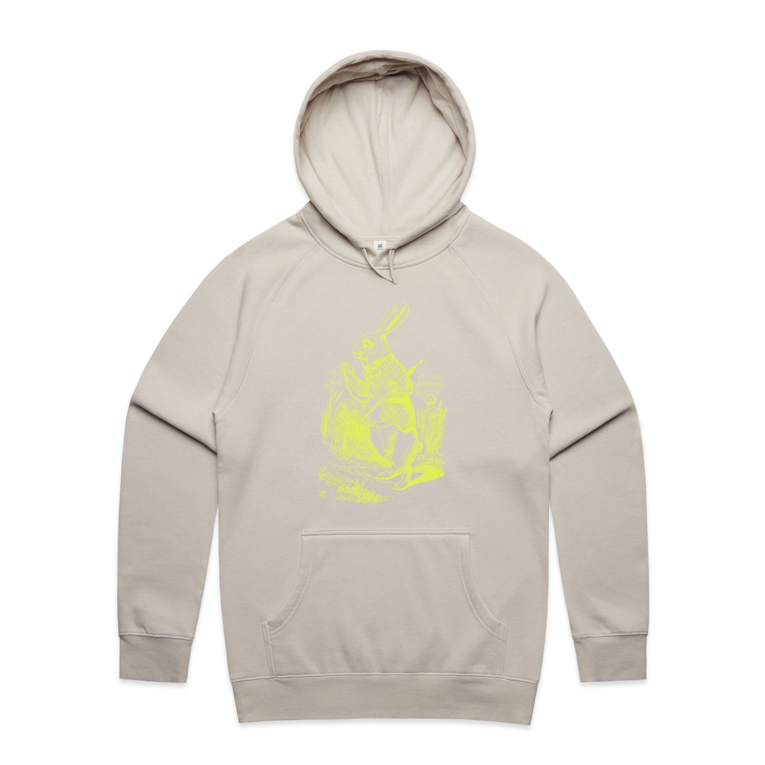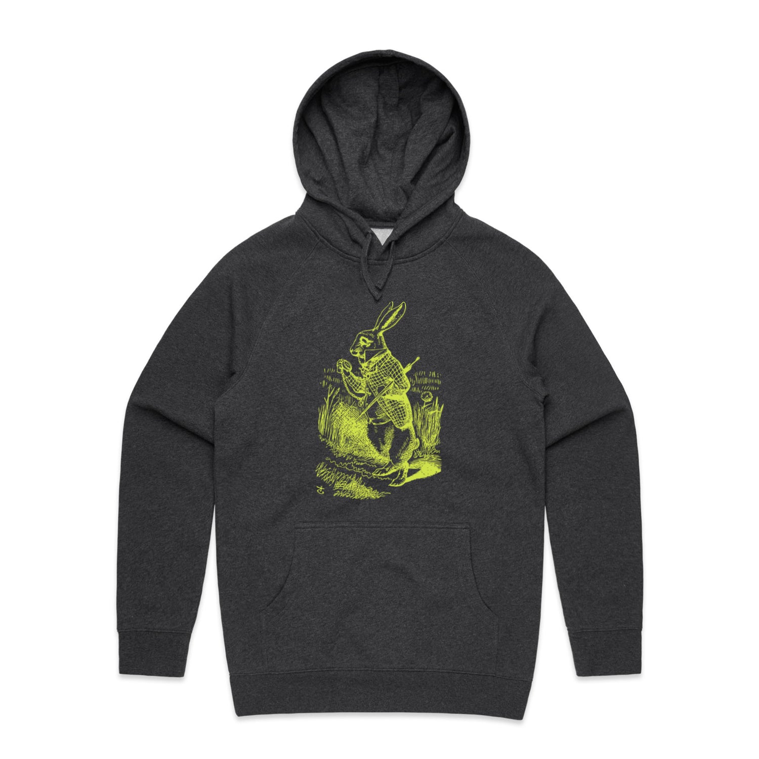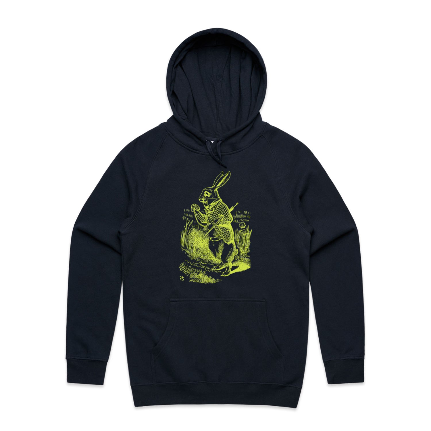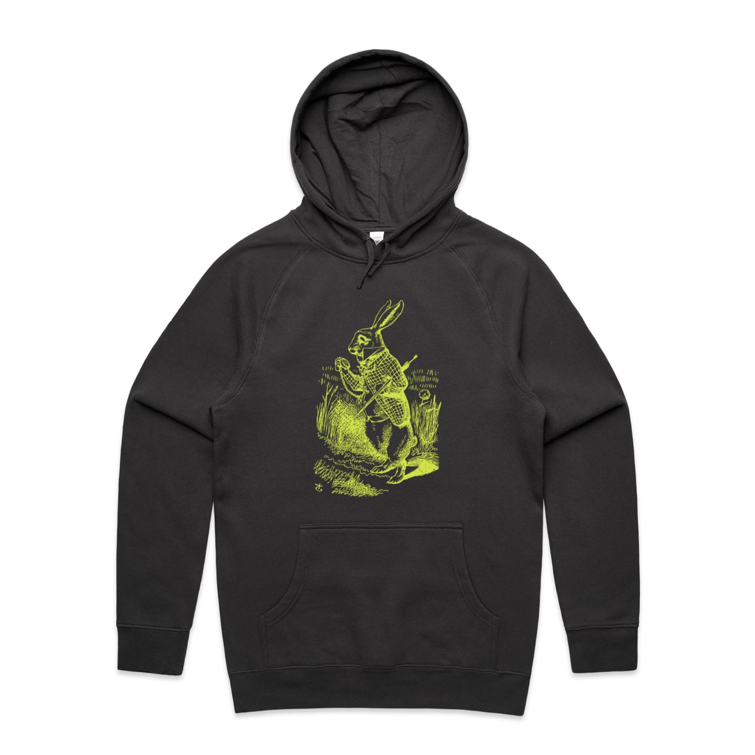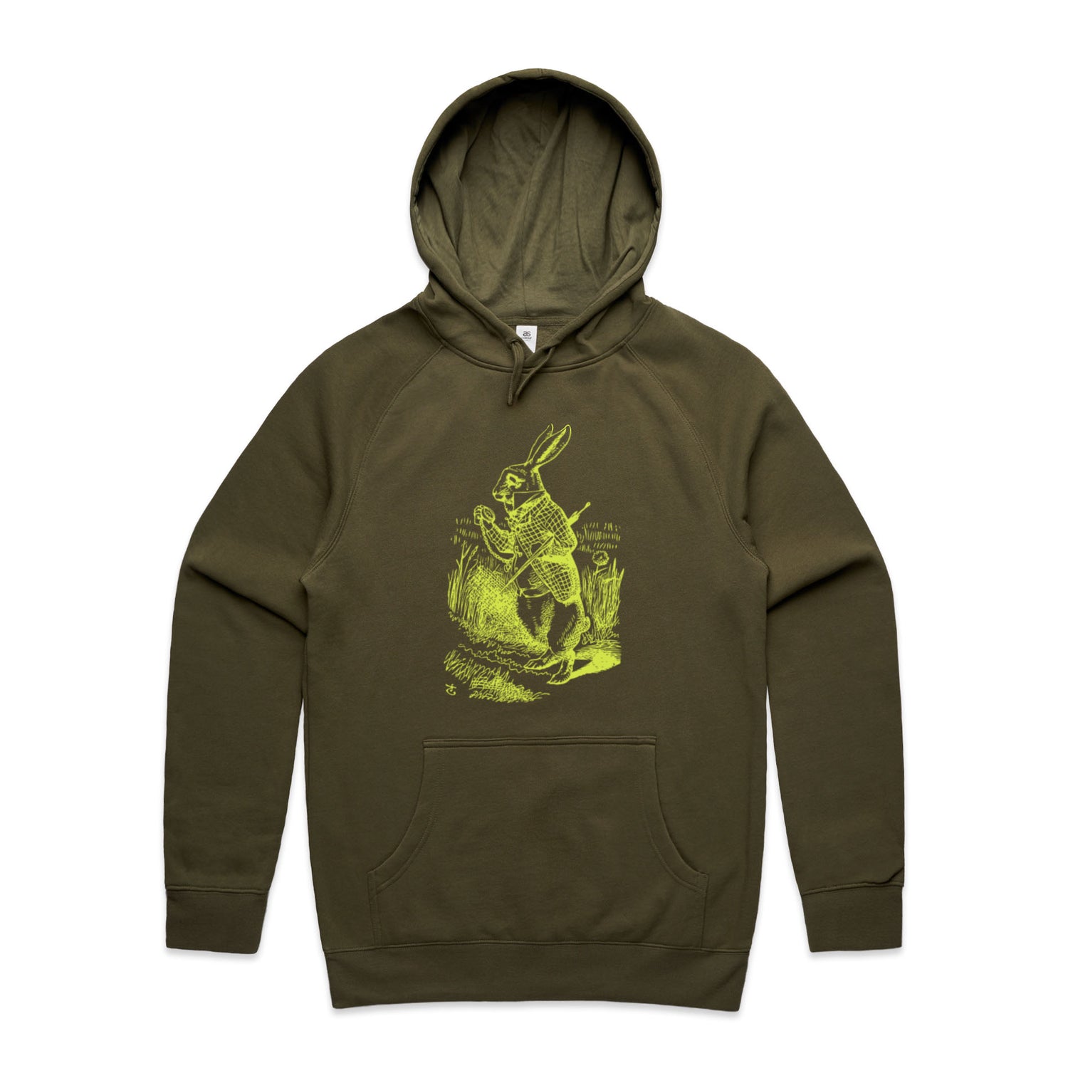 The Hoodies Alice in Wonderland - The White Rabbit – Men's Hooded Sweatshirt is a high-quality men's hooded sweatshirt, printed with fluoro yellow ink on the trusted AS Colour Supply Hood 5101. With a regular fit and mid-weight feel, it's crafted from a premium blend of 80% cotton and 20% polyester anti-pill fleece, making it a durable and comfortable staple for any wardrobe. The pullover design features raglan sleeves, a lined hood with tonal drawcord, ribbed sleeve cuffs, and a roomy kangaroo pocket — all designed to keep you warm while looking effortlessly sharp.