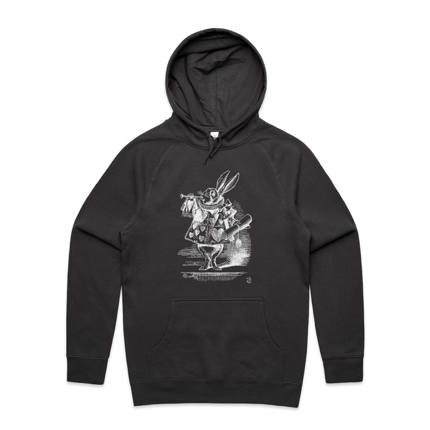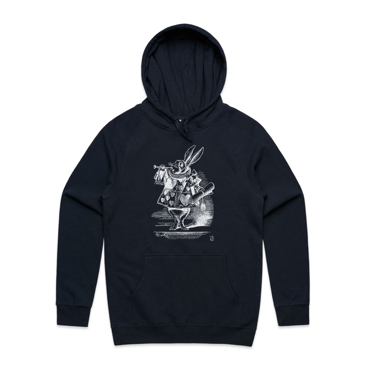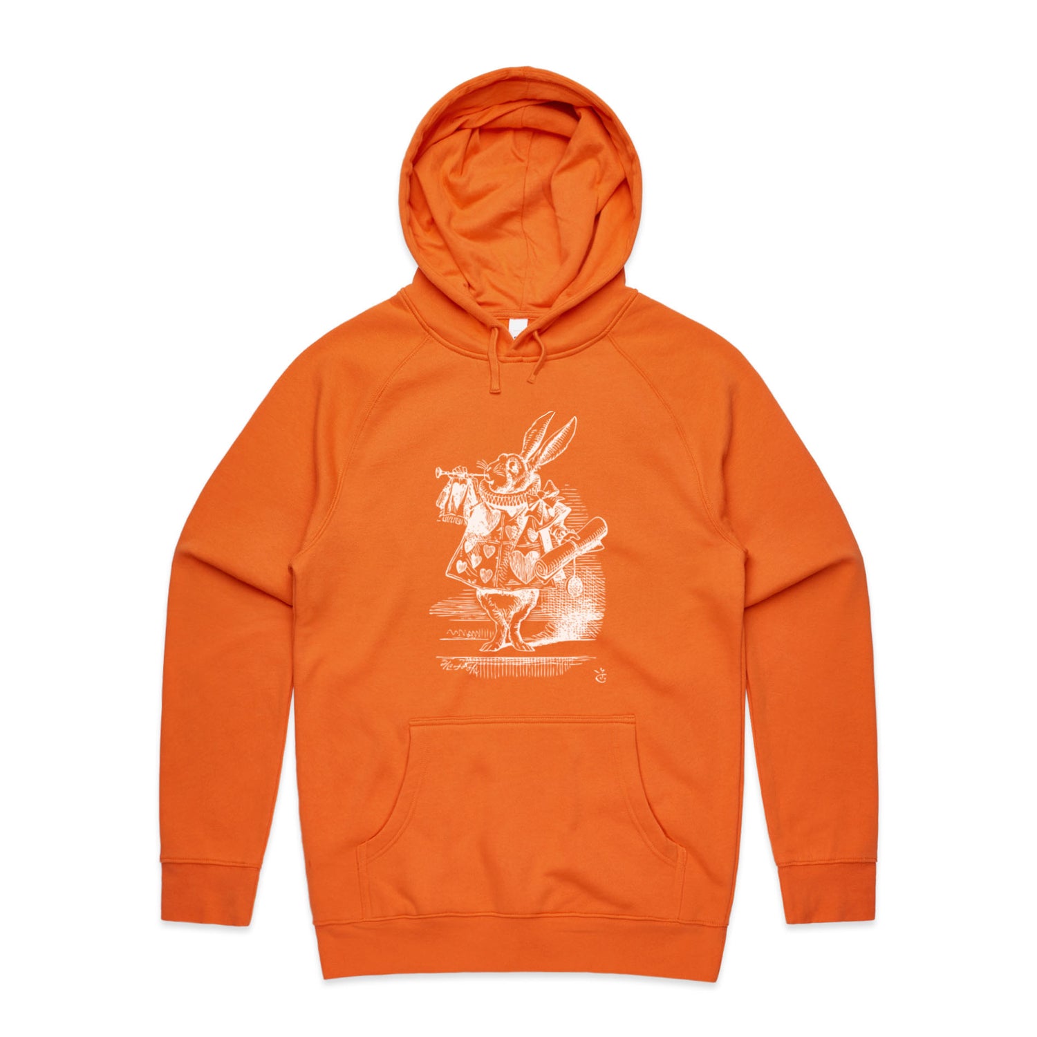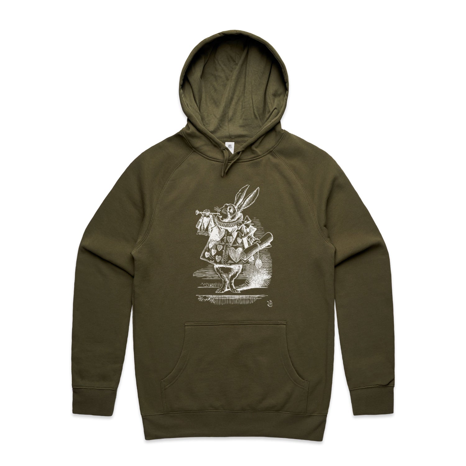 The Hoodies Alice in Wonderland - The White Rabbit Herald – Men's Hooded Sweatshirt is a high-quality men's hooded sweatshirt, printed with white ink on the trusted AS Colour Supply Hood 5101. With a regular fit and mid-weight feel, it's crafted from a premium blend of 80% cotton and 20% polyester anti-pill fleece, making it a durable and comfortable staple for any wardrobe. The pullover design features raglan sleeves, a lined hood with tonal drawcord, ribbed sleeve cuffs, and a roomy kangaroo pocket — all designed to keep you warm while looking effortlessly sharp.