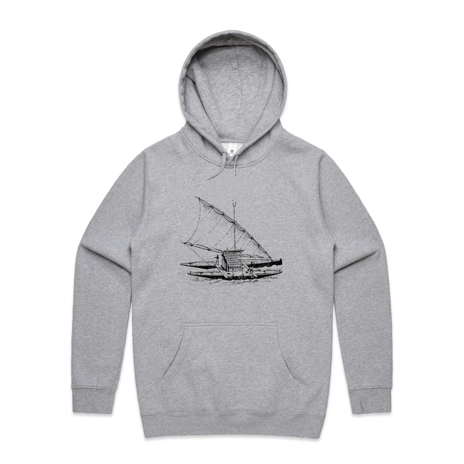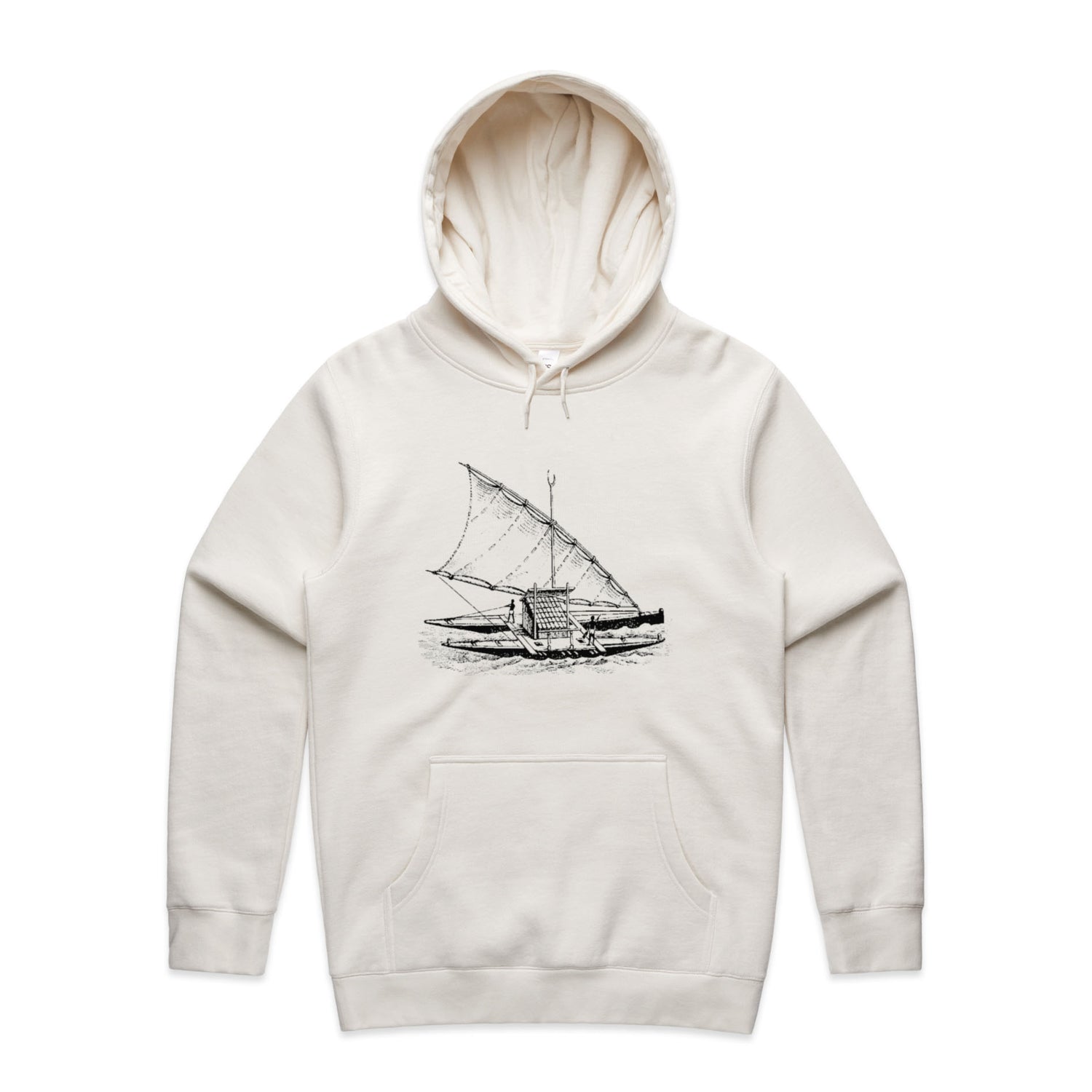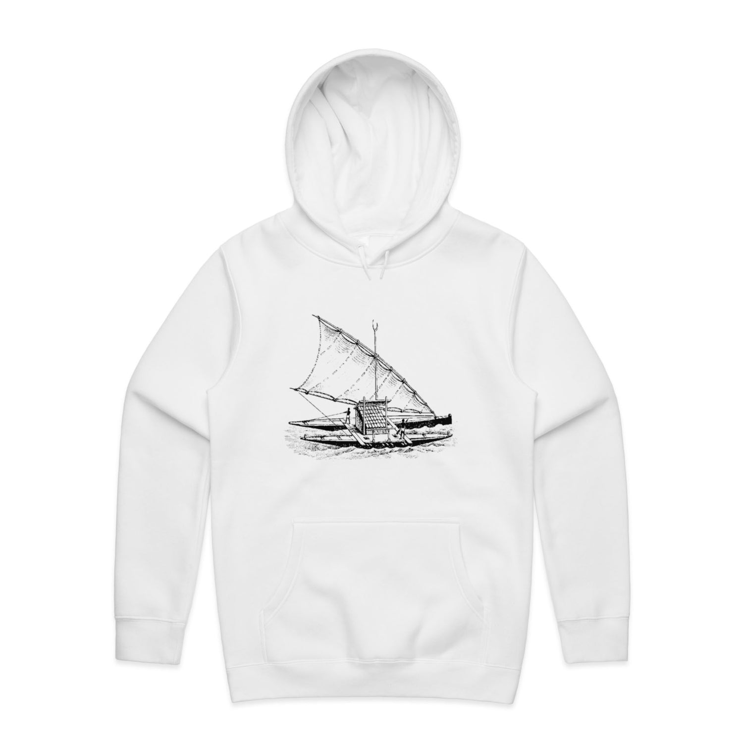 With a regular fit that'll keep you looking effortlessly rad, it features a classic pullover hood, kangaroo pocket for all your essentials (or maybe just your hands), and a lined hood ready to shield you from unexpected weather tantrums. And let's not forget those clean, black ink boat prints, making sure you stand out in just the right way—like a stealth captain navigating through the bustling streets.