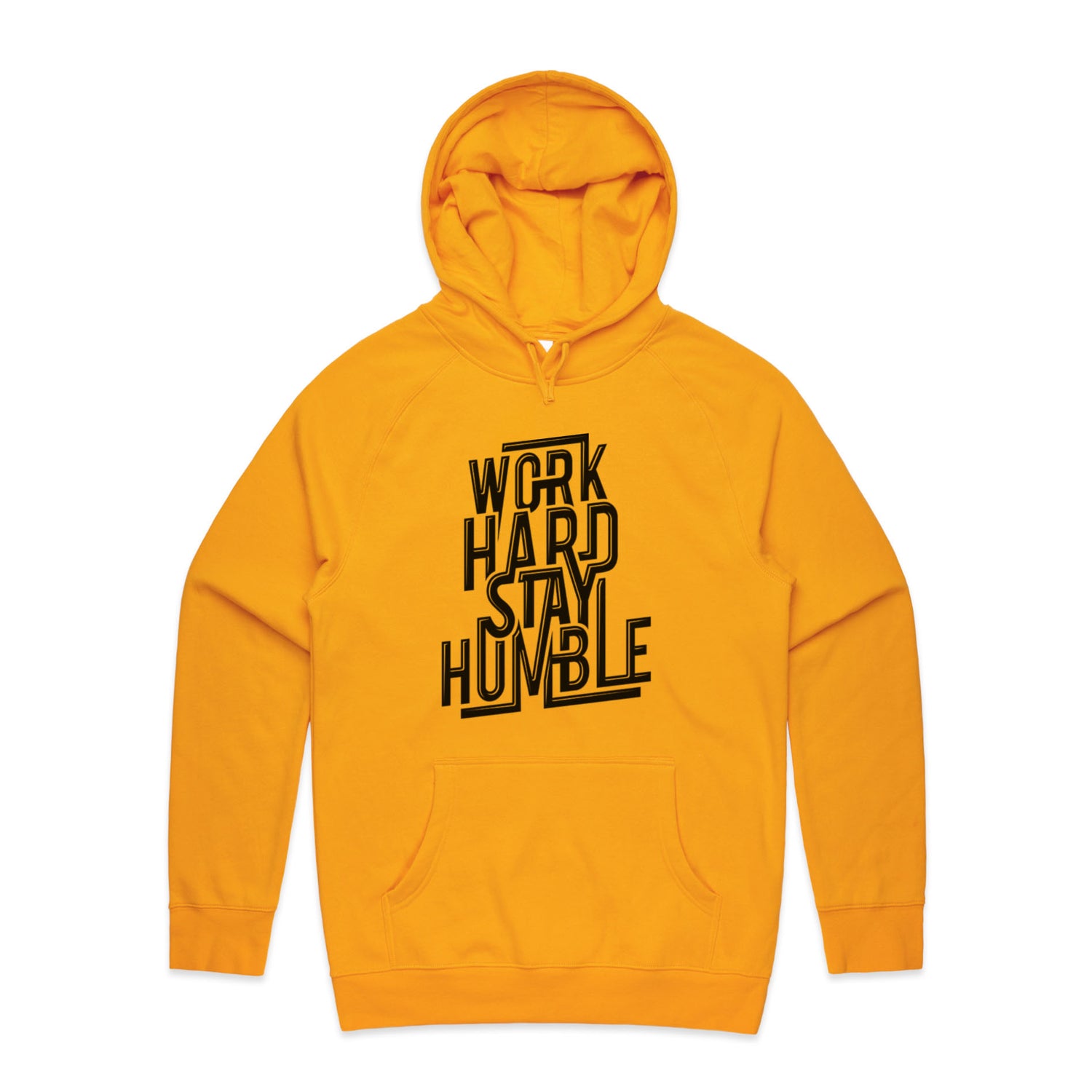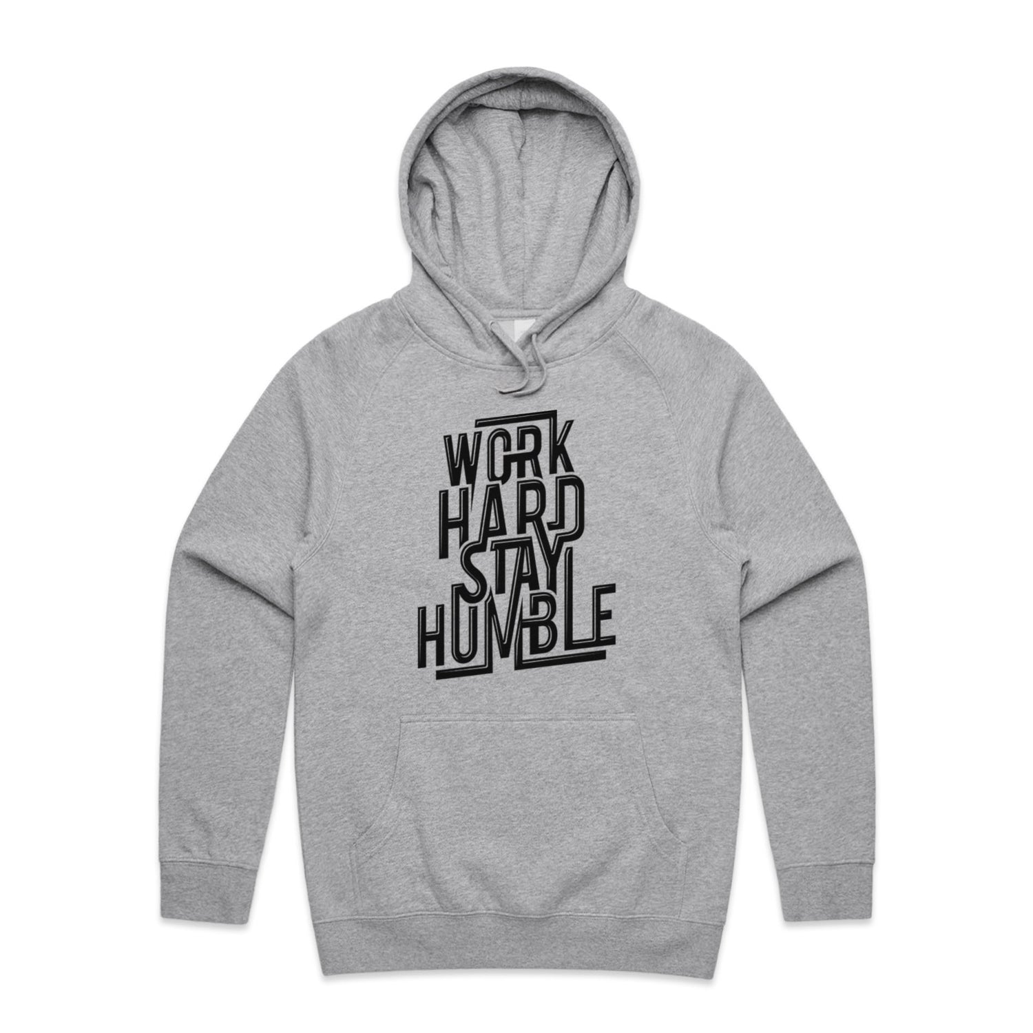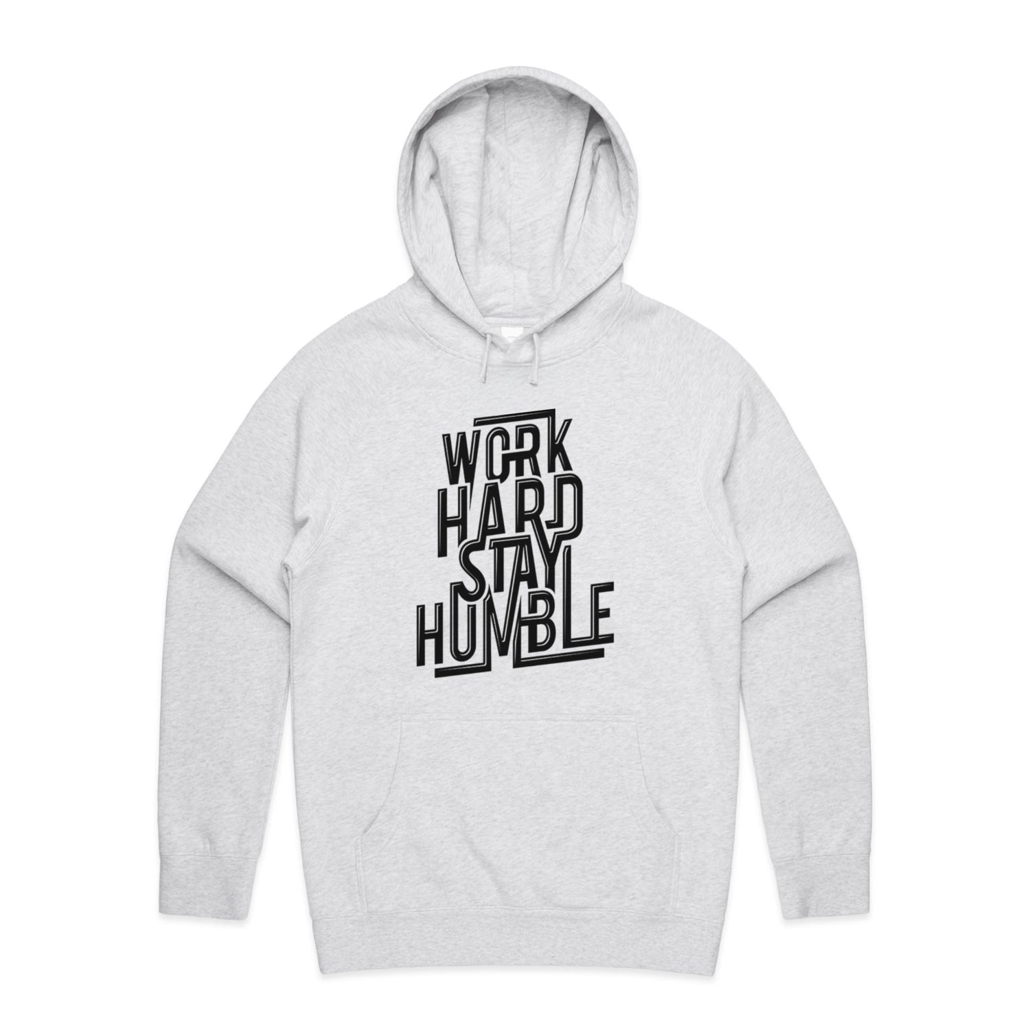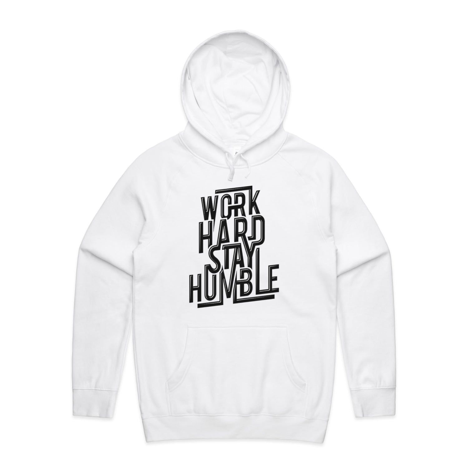 The Hoodies Work Hard Stay Humble – Men's Hooded Sweatshirt is a high-quality men's hooded sweatshirt, printed with black ink on the trusted AS Colour Supply Hood 5101. With a regular fit and mid-weight feel, it's crafted from a premium blend of 80% cotton and 20% polyester anti-pill fleece, making it a durable and comfortable staple for any wardrobe. The pullover design features raglan sleeves, a lined hood with tonal drawcord, ribbed sleeve cuffs, and a roomy kangaroo pocket — all designed to keep you warm while looking effortlessly sharp.