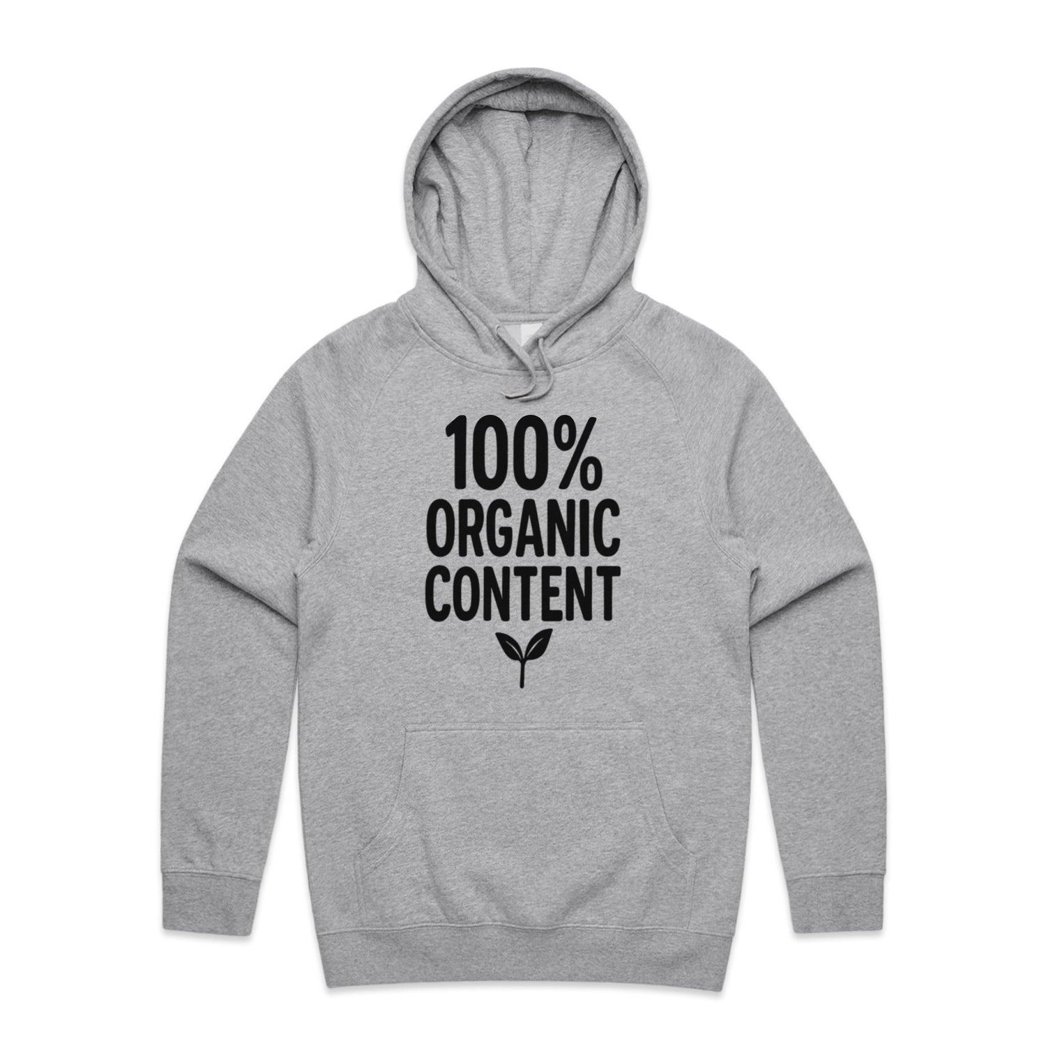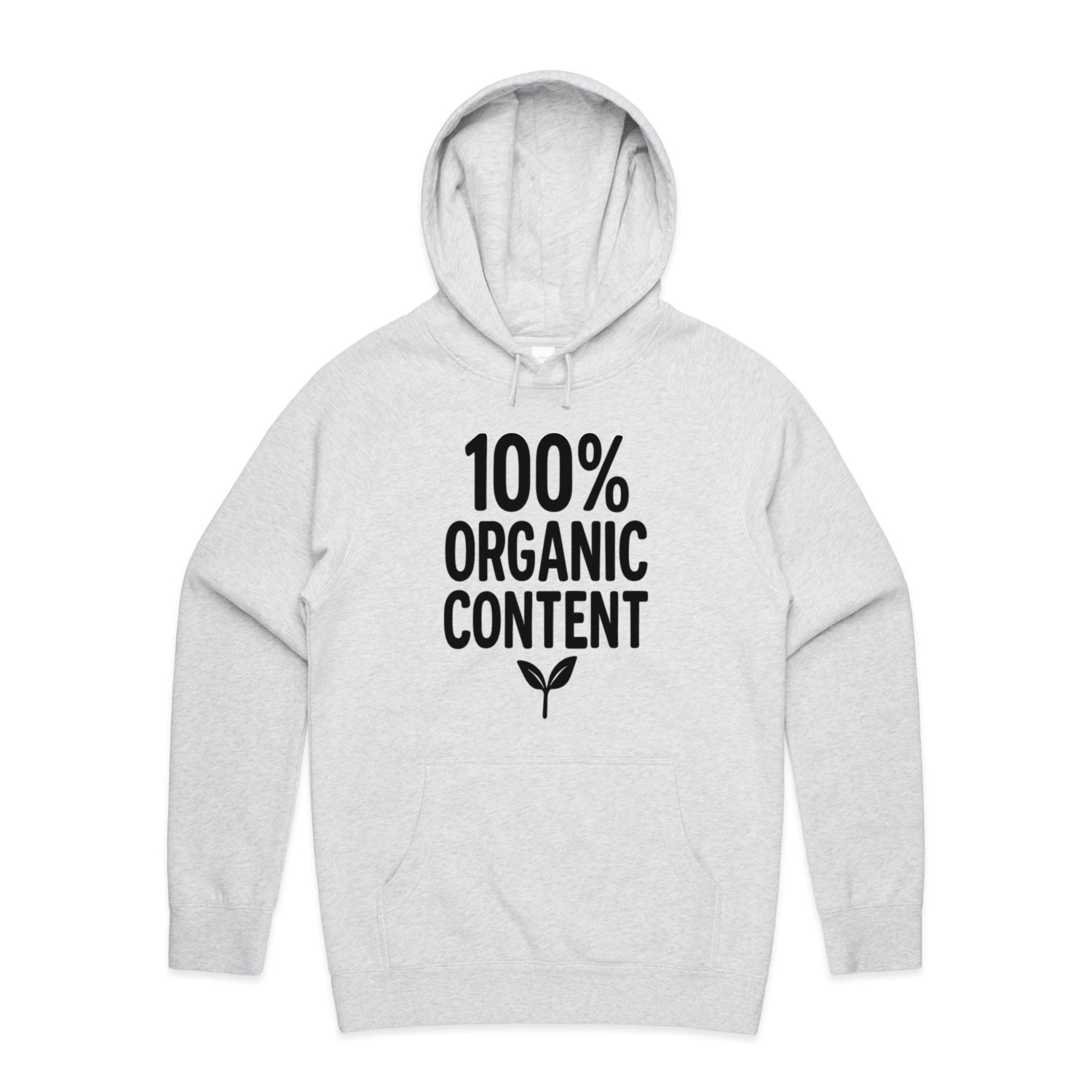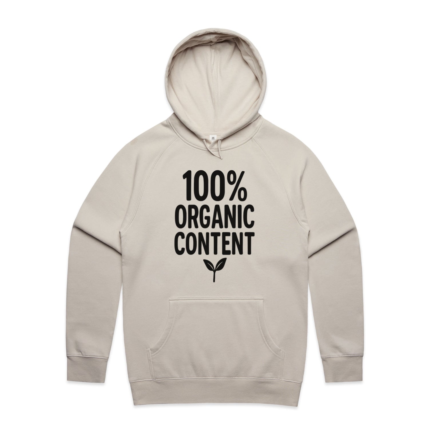 The Hoodies 100 Percent Organic Content – Men's Hooded Sweatshirt is a high-quality men's hooded sweatshirt, printed with black ink on the trusted AS Colour Supply Hood 5101. With a regular fit and mid-weight feel, it's crafted from a premium blend of 80% cotton and 20% polyester anti-pill fleece, making it a durable and comfortable staple for any wardrobe. The pullover design features raglan sleeves, a lined hood with tonal drawcord, ribbed sleeve cuffs, and a roomy kangaroo pocket — all designed to keep you warm while looking effortlessly sharp.