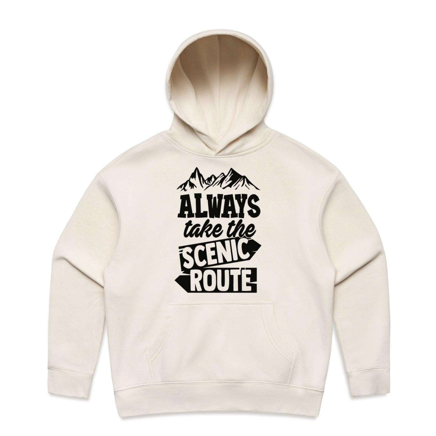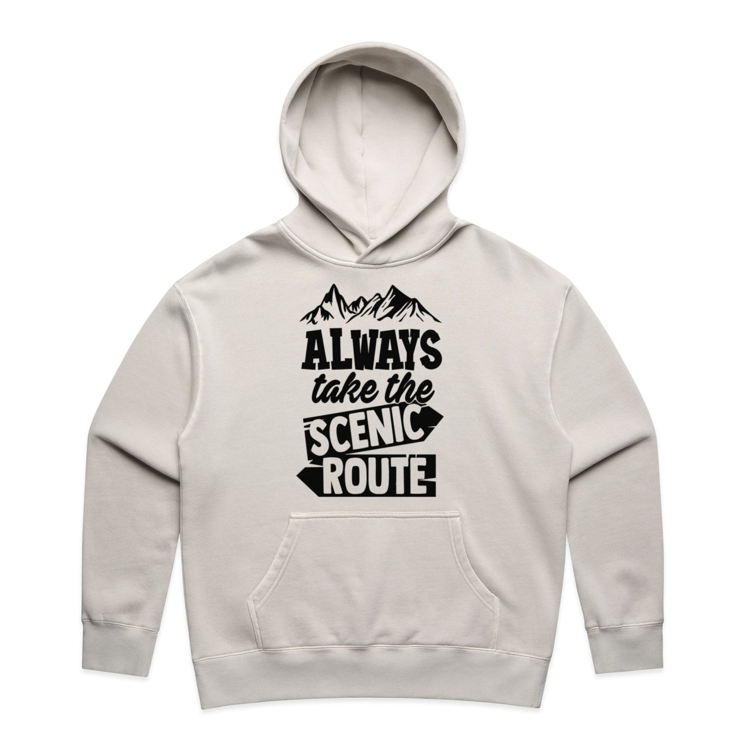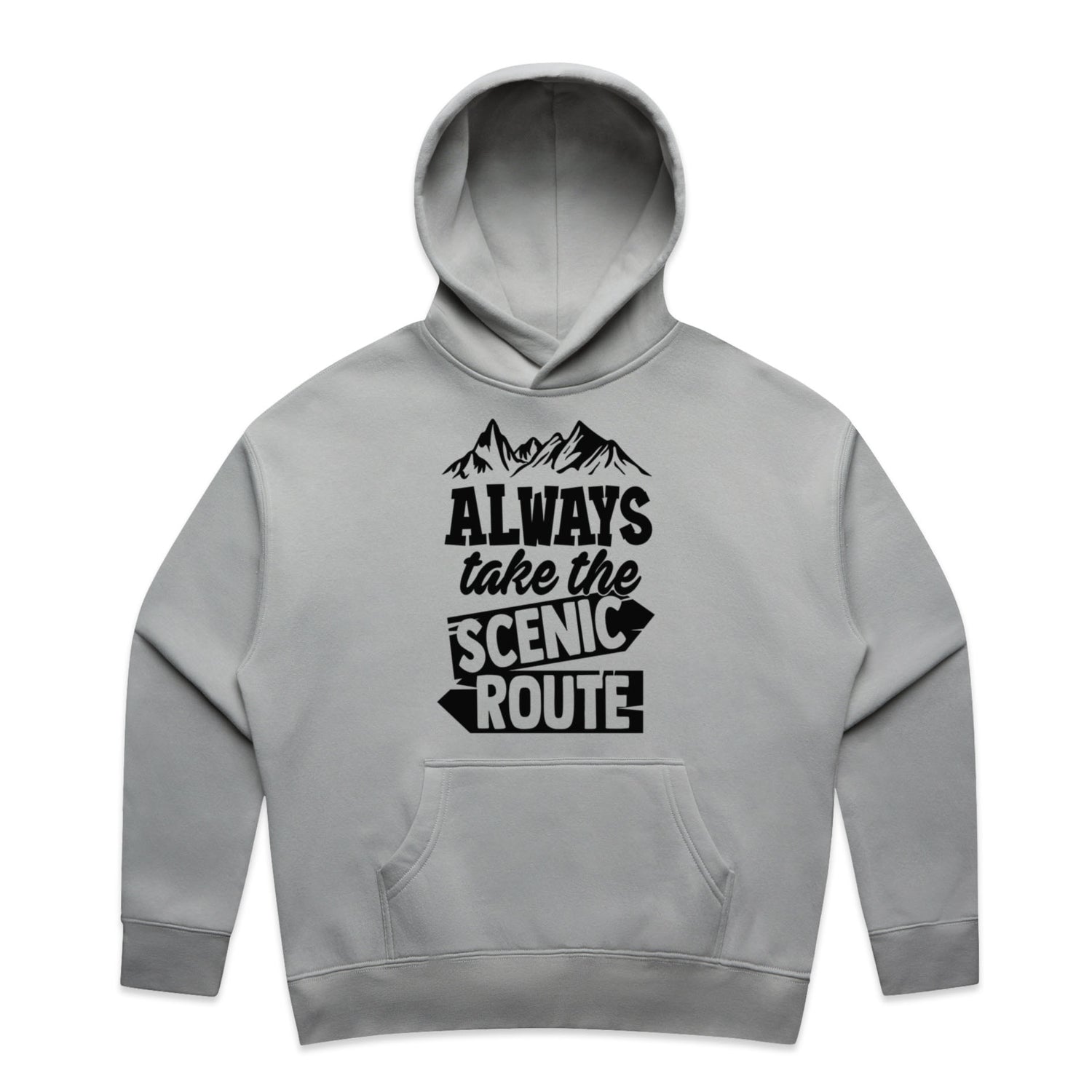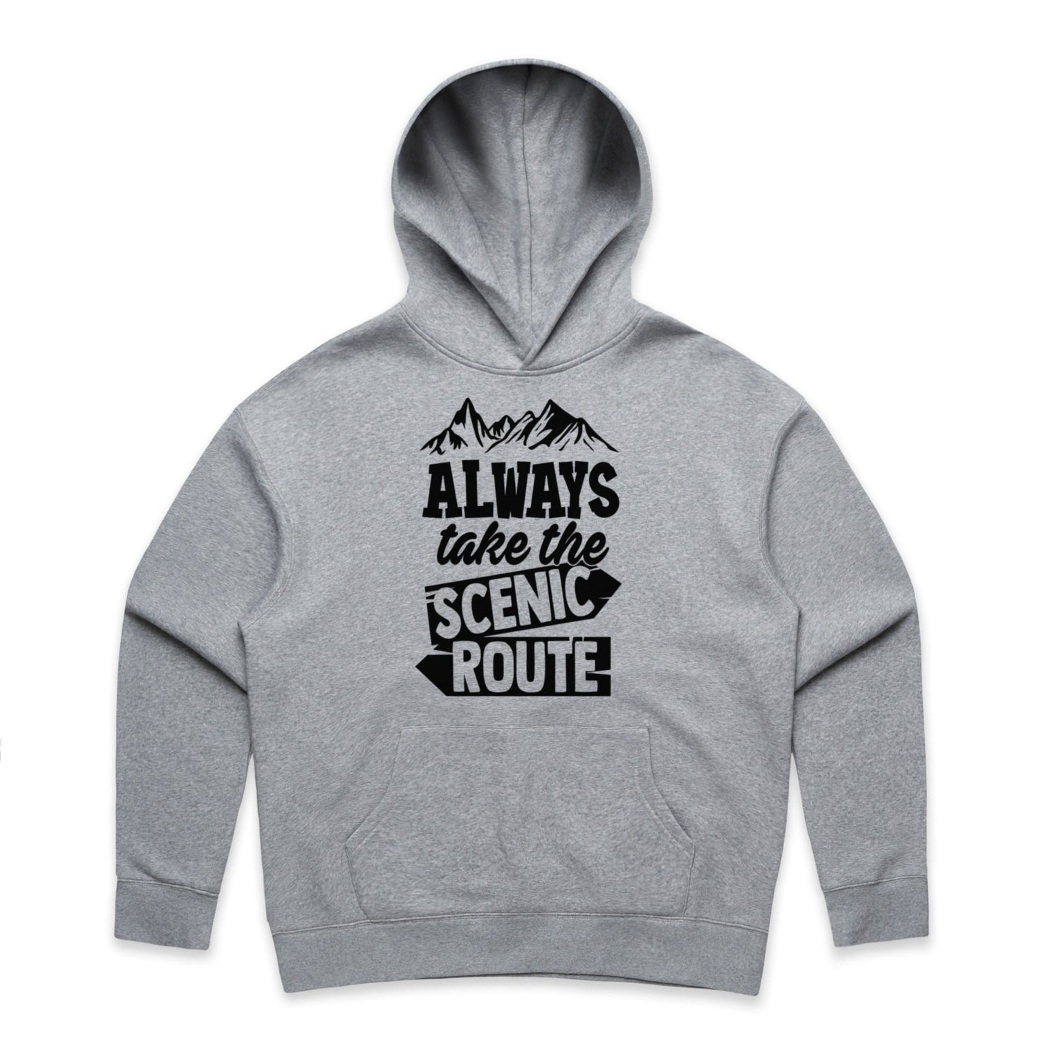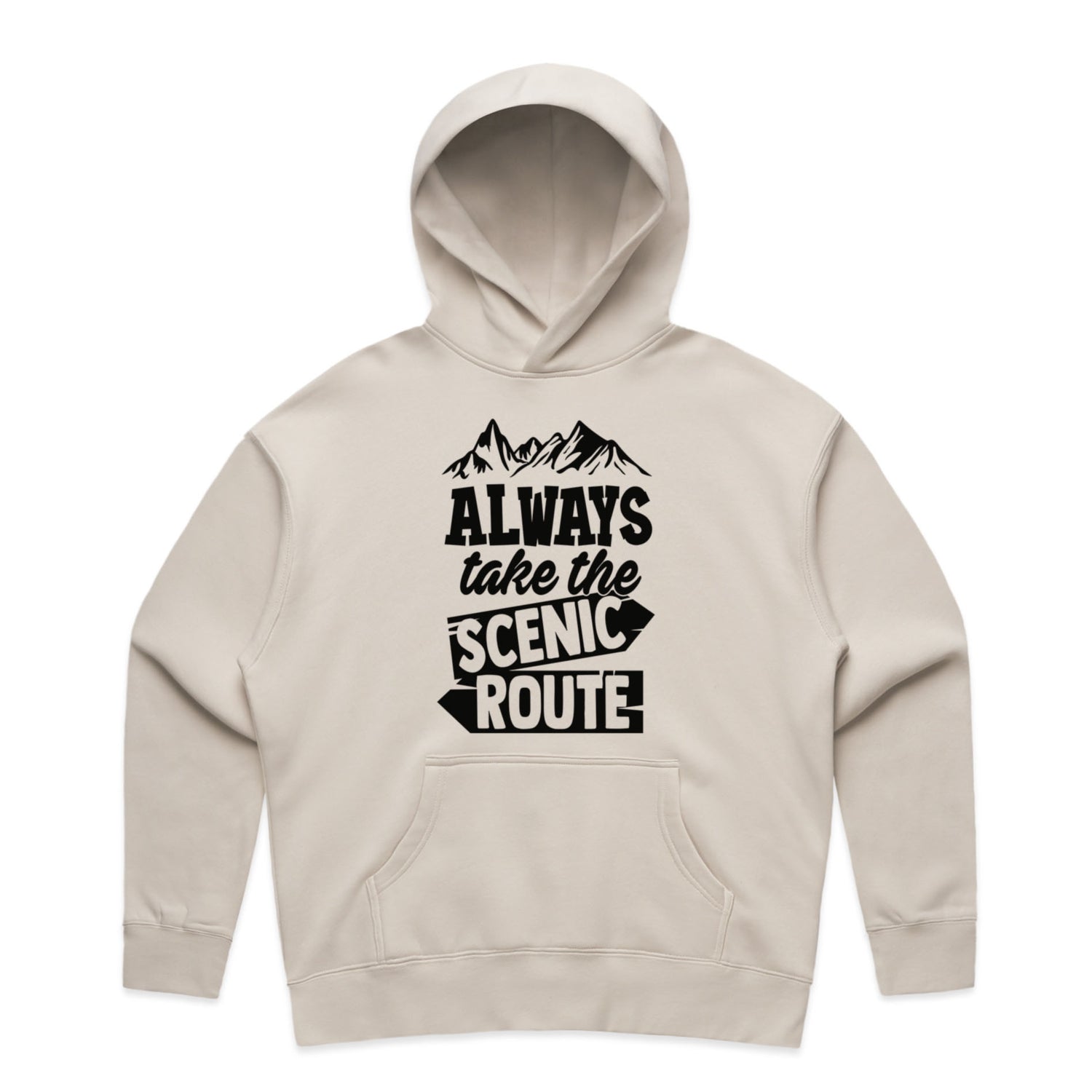 Get ready to hit the road in style with TheHoodie's Always Scenic Route hoodie, your ultimate travel buddy for all adventure-seekers! Made for those who live life on the scenic route, this hoodie rocks a minimal yet bold black typography print that'll make your wanderlust heart sing. Whether you're exploring the outback or just dreaming about your next trip, this hoodie’s got you covered in comfort.