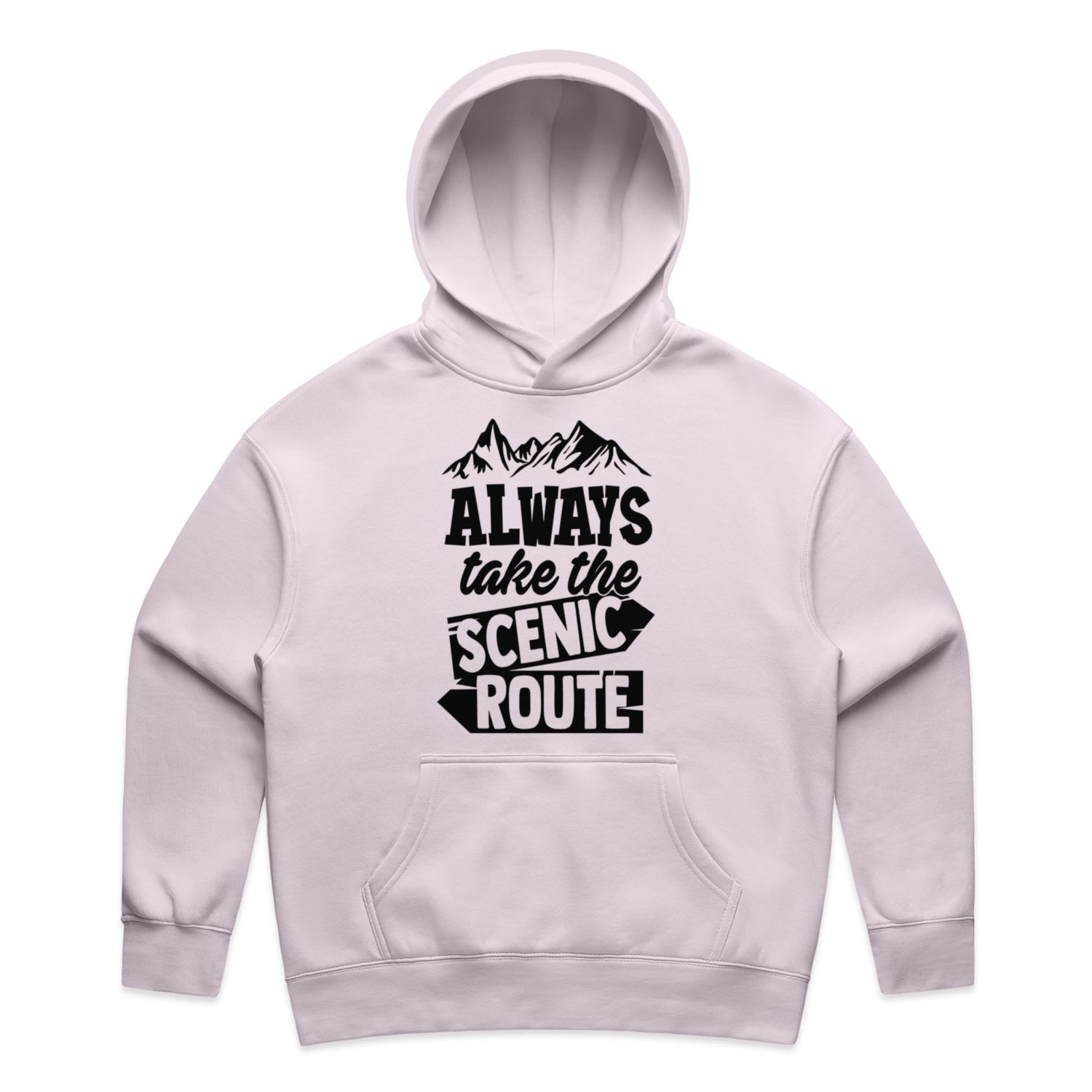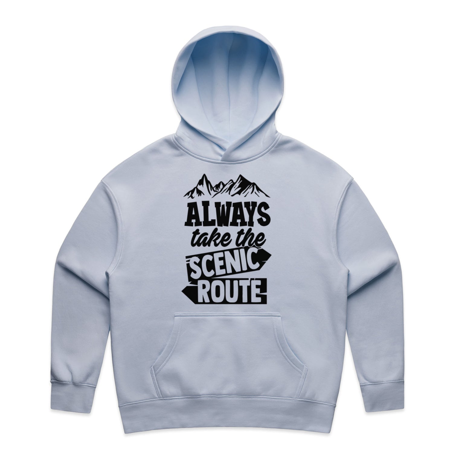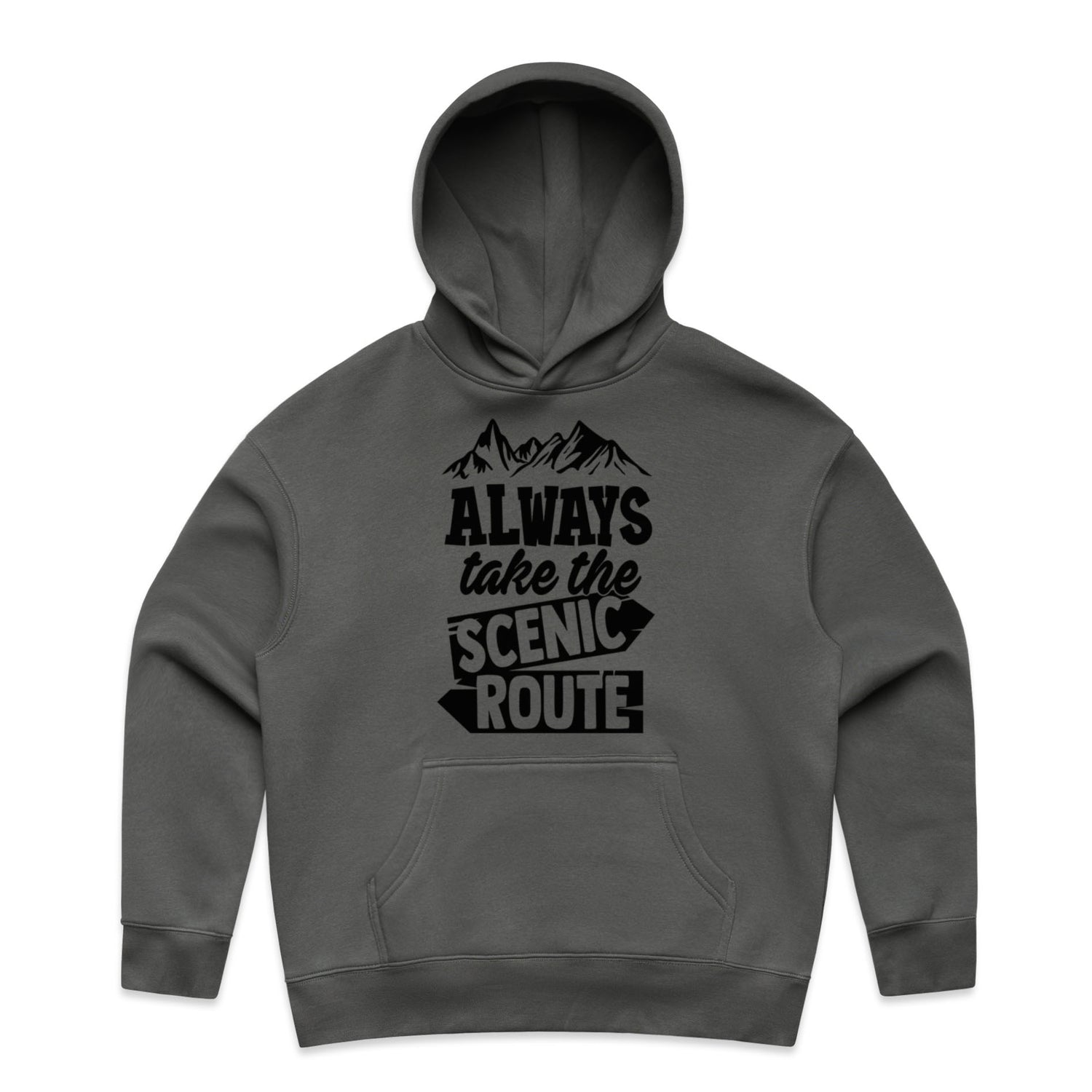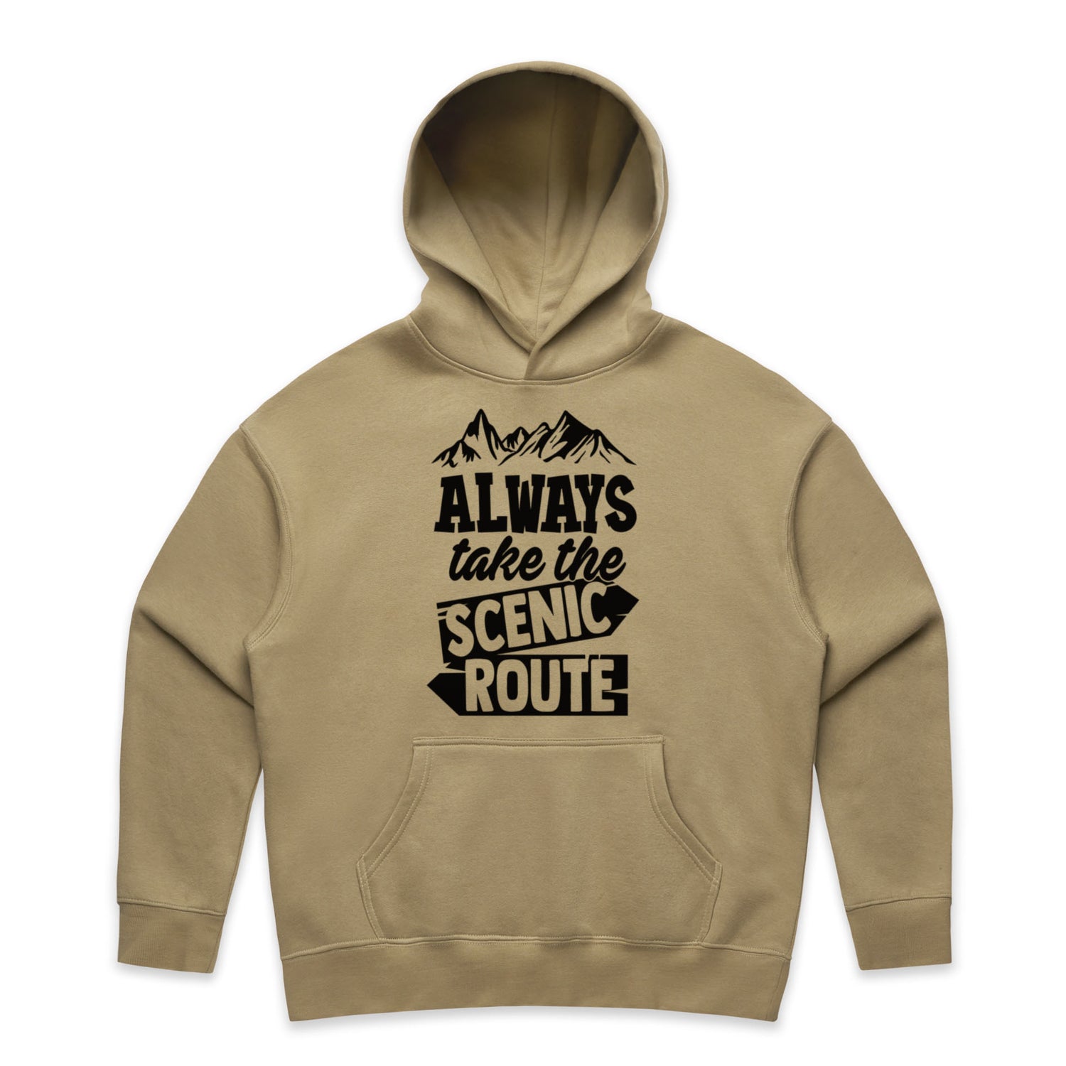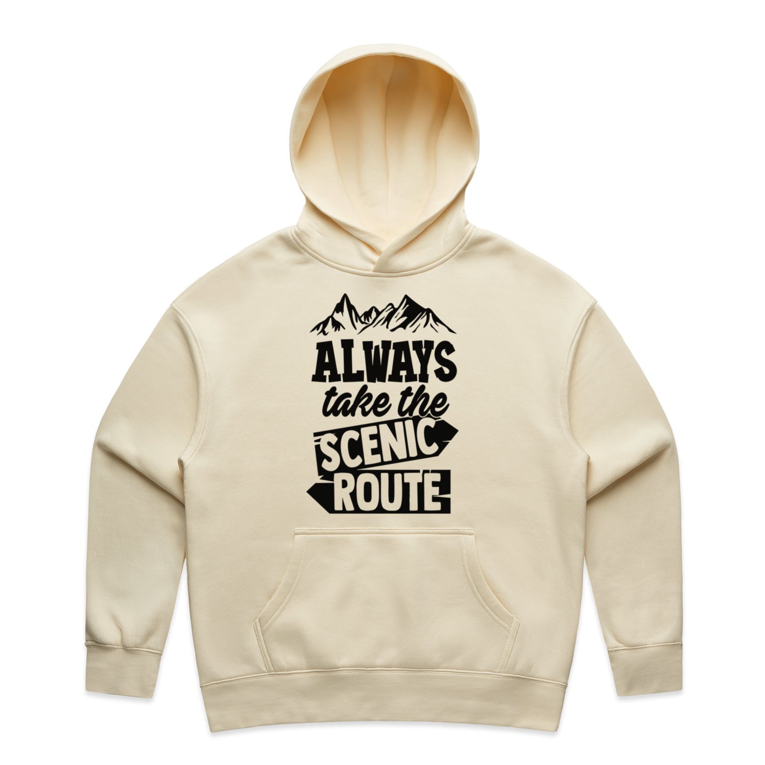 Get ready to hit the road in style with TheHoodie's Always Scenic Route hoodie, your ultimate travel buddy for all adventure-seekers! Made for those who live life on the scenic route, this hoodie rocks a minimal yet bold black typography print that'll make your wanderlust heart sing. Whether you're exploring the outback or just dreaming about your next trip, this hoodie’s got you covered in comfort.