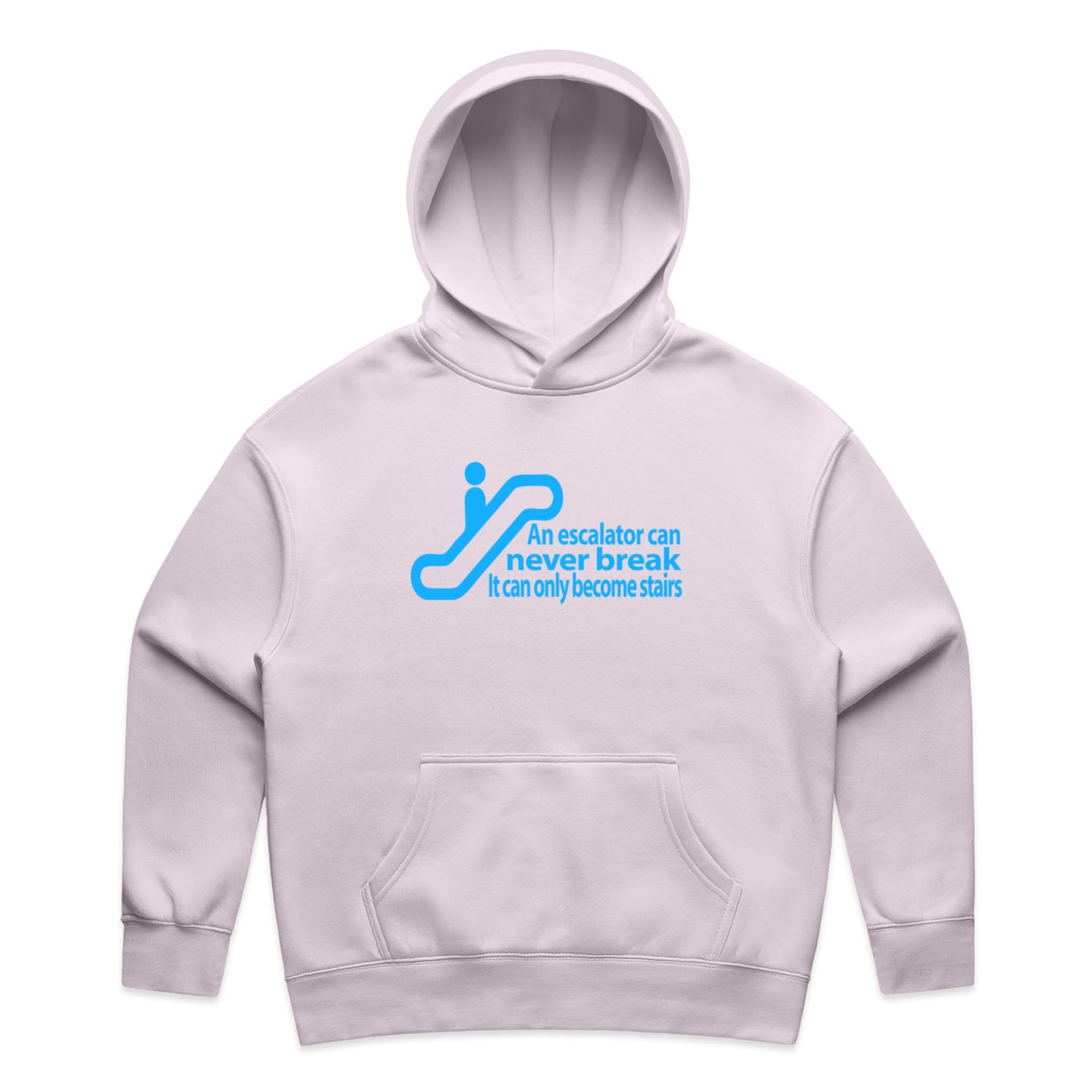 Get ready to level up your hoodie game with "An Escalator Can Never Break" women's hooded sweatshirt! This isn't just a hoodie—it's a cheeky statement piece with a tongue-in-cheek twist. Printed in a vibrant Cyan ink, this beauty brings a splash of colour and humour to your wardrobe, guaranteed to catch eyes and crack smiles.