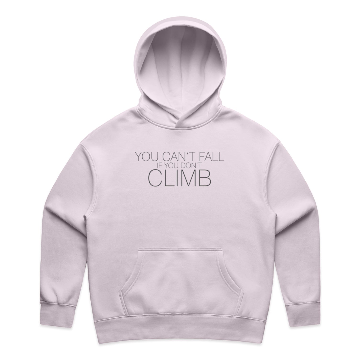 Boasting a sleek grey ink print, this hoodie shouts out the ultimate words of wisdom with "Can't Fall if You Don't Climb" across the chest. Ideal for layering, lounging, or heading out for a cheeky arvo with your mates, it pairs perfectly with jeans, leggings, or whatever floats your boat.