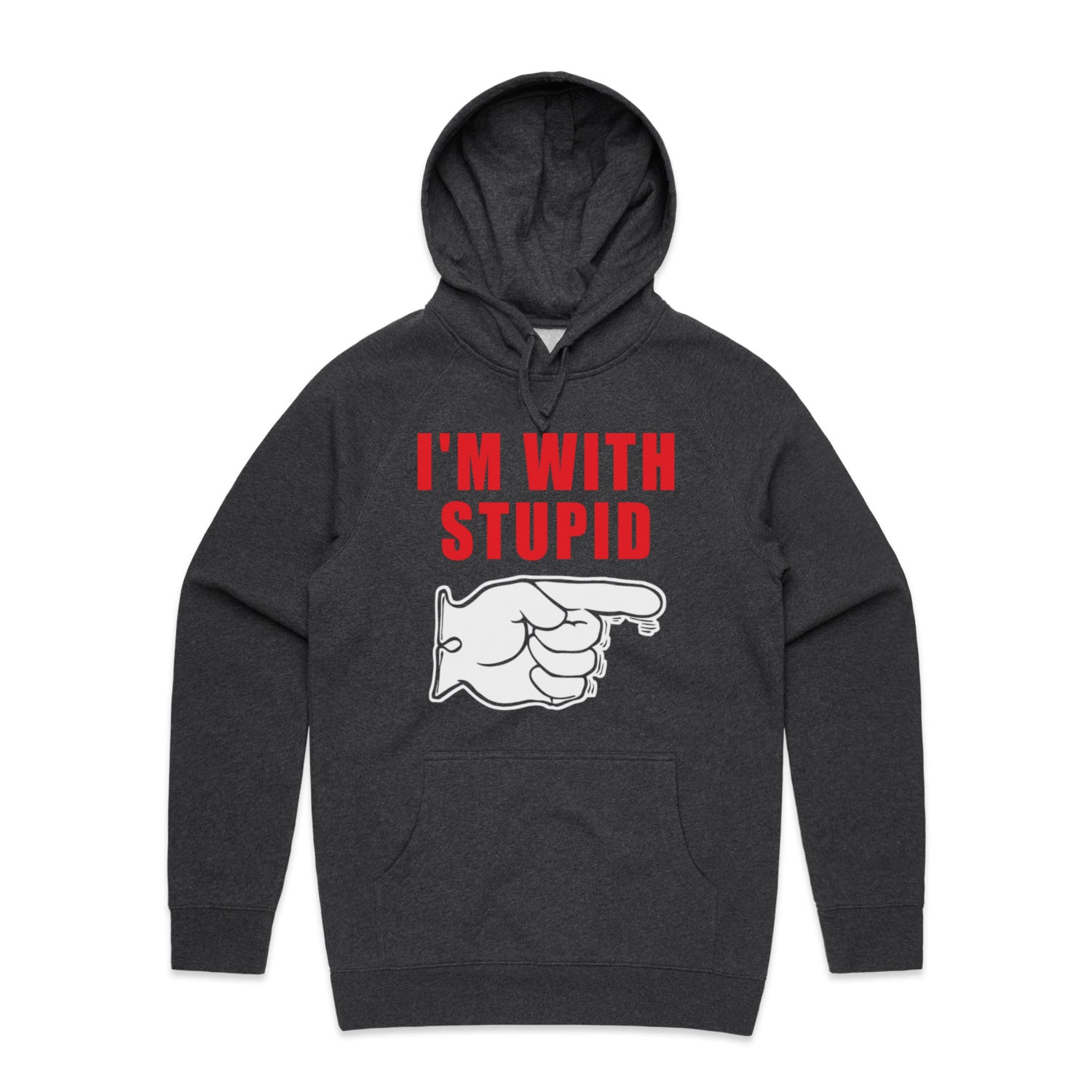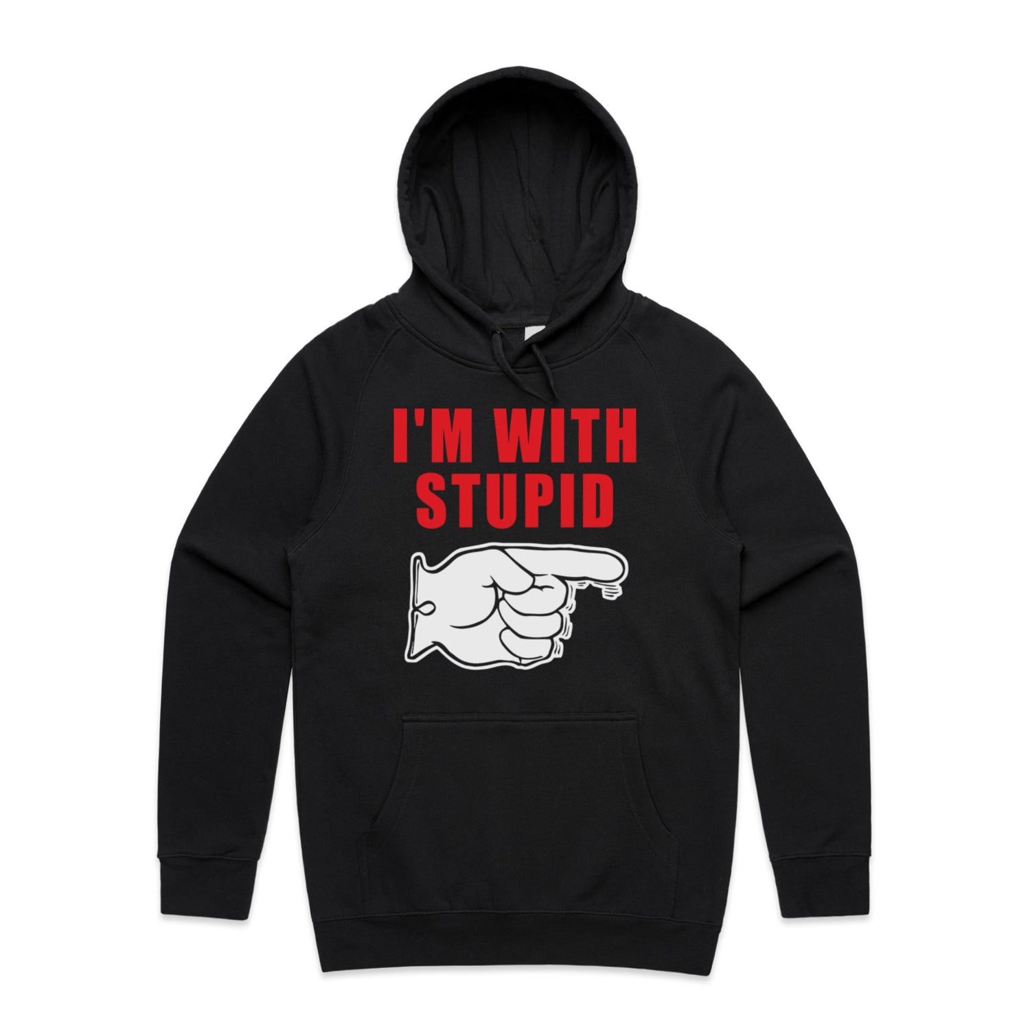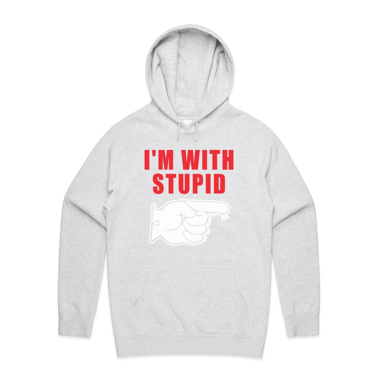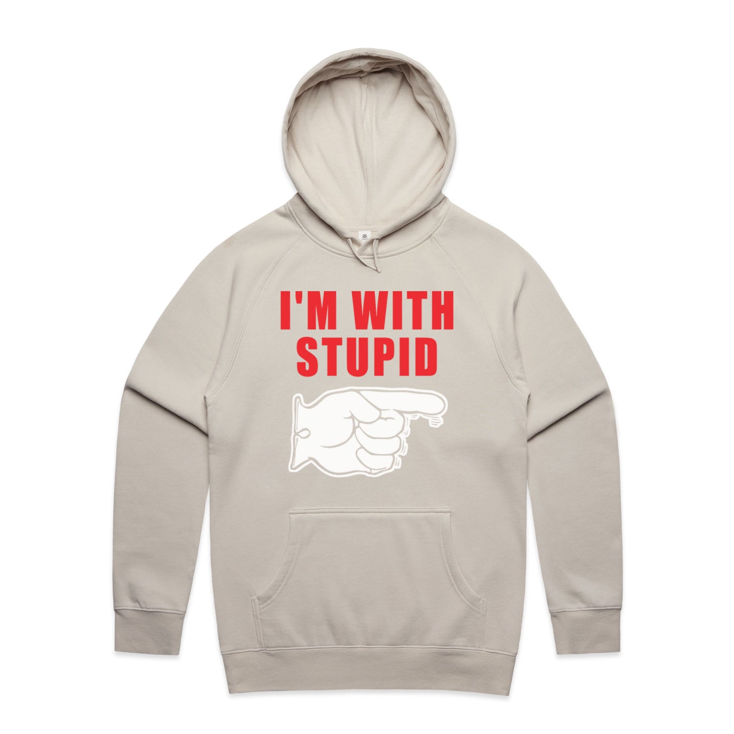 The Hoodies I'm with Stupid – Men's Hooded Sweatshirt is a high-quality men's hooded sweatshirt, printed with multicoloured ink on the trusted AS Colour Supply Hood 5101. With a regular fit and mid-weight feel, it's crafted from a premium blend of 80% cotton and 20% polyester anti-pill fleece, making it a durable and comfortable staple for any wardrobe. The pullover design features raglan sleeves, a lined hood with tonal drawcord, ribbed sleeve cuffs, and a roomy kangaroo pocket — all designed to keep you warm while looking effortlessly sharp.