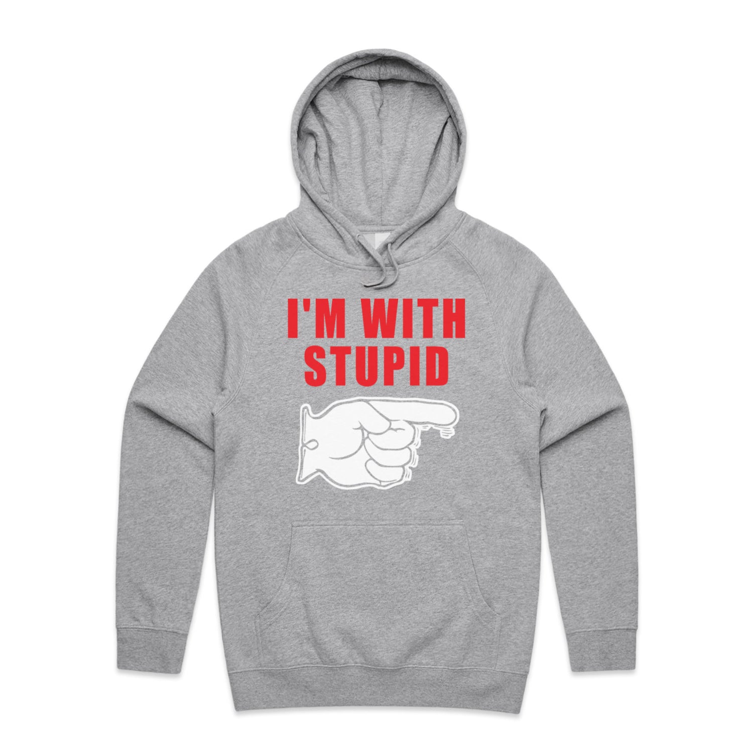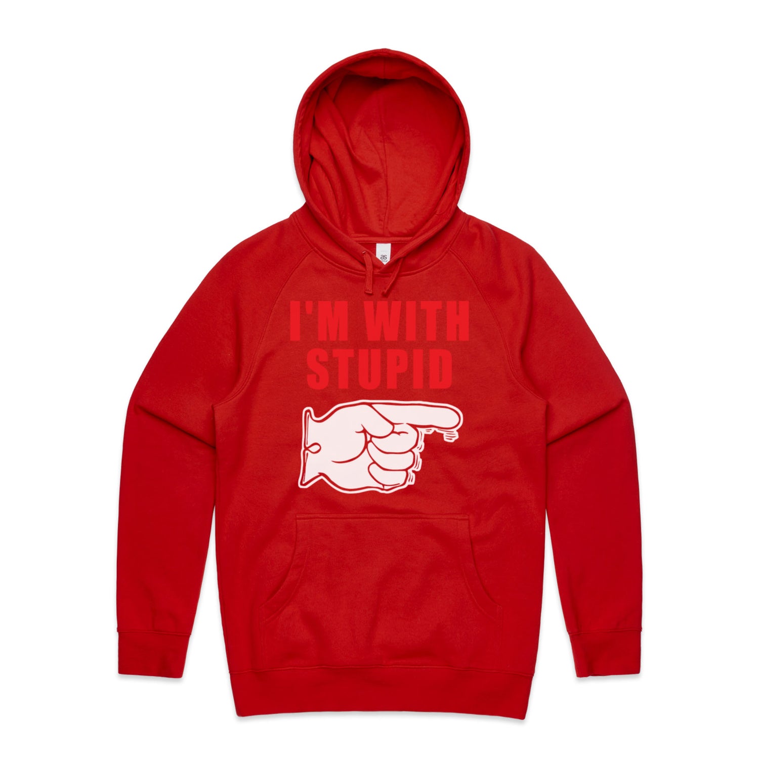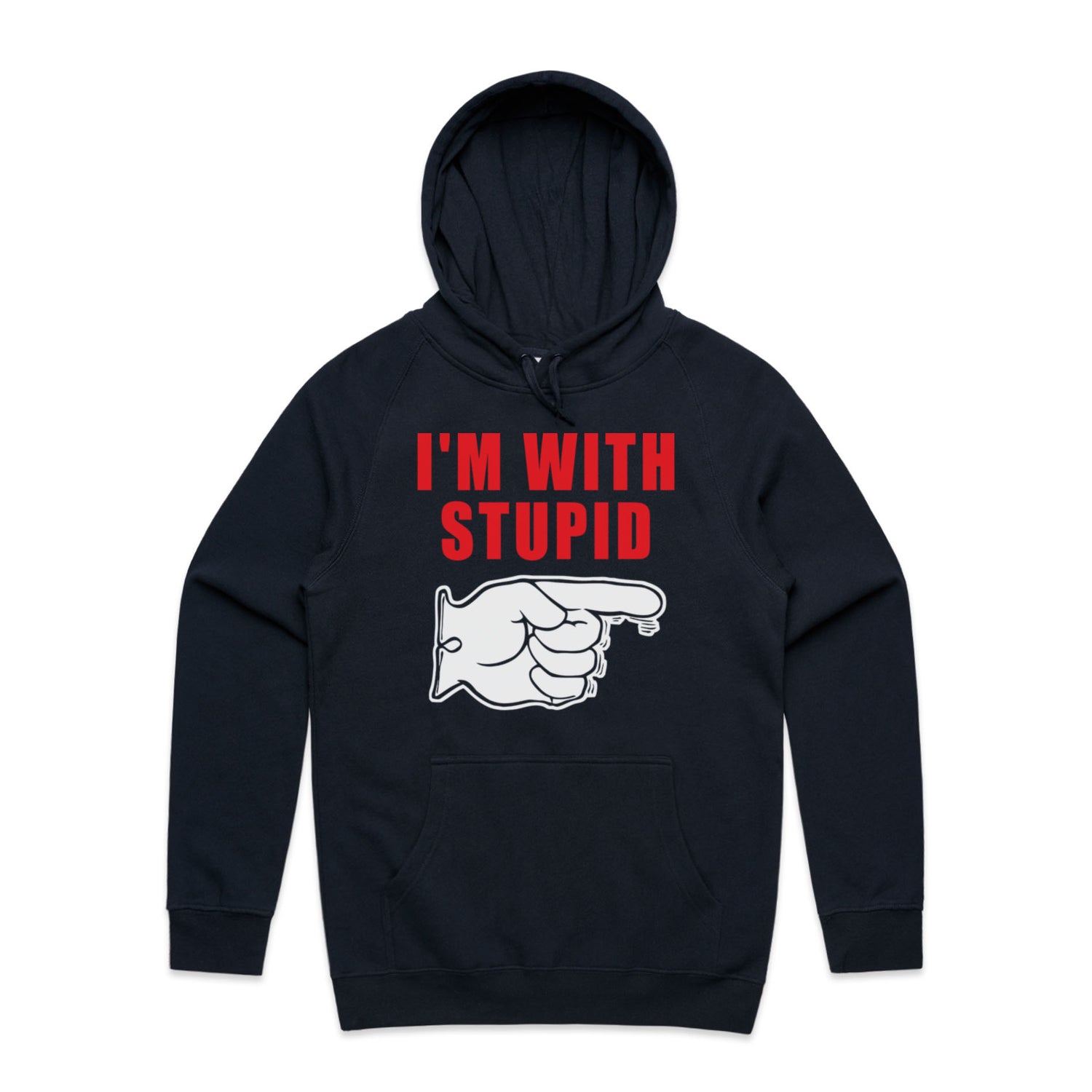 The Hoodies I'm with Stupid – Men's Hooded Sweatshirt is a high-quality men's hooded sweatshirt, printed with multicoloured ink on the trusted AS Colour Supply Hood 5101. With a regular fit and mid-weight feel, it's crafted from a premium blend of 80% cotton and 20% polyester anti-pill fleece, making it a durable and comfortable staple for any wardrobe. The pullover design features raglan sleeves, a lined hood with tonal drawcord, ribbed sleeve cuffs, and a roomy kangaroo pocket — all designed to keep you warm while looking effortlessly sharp.