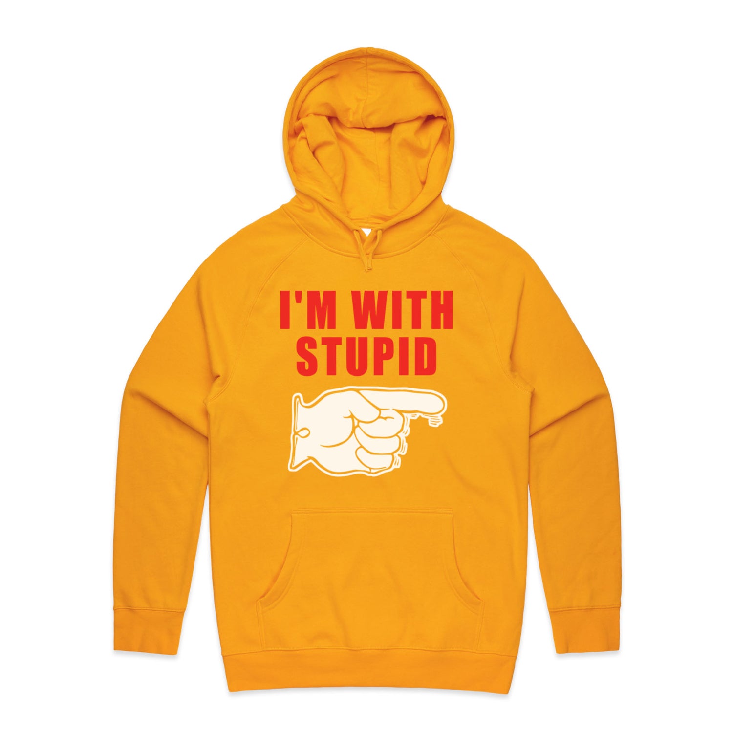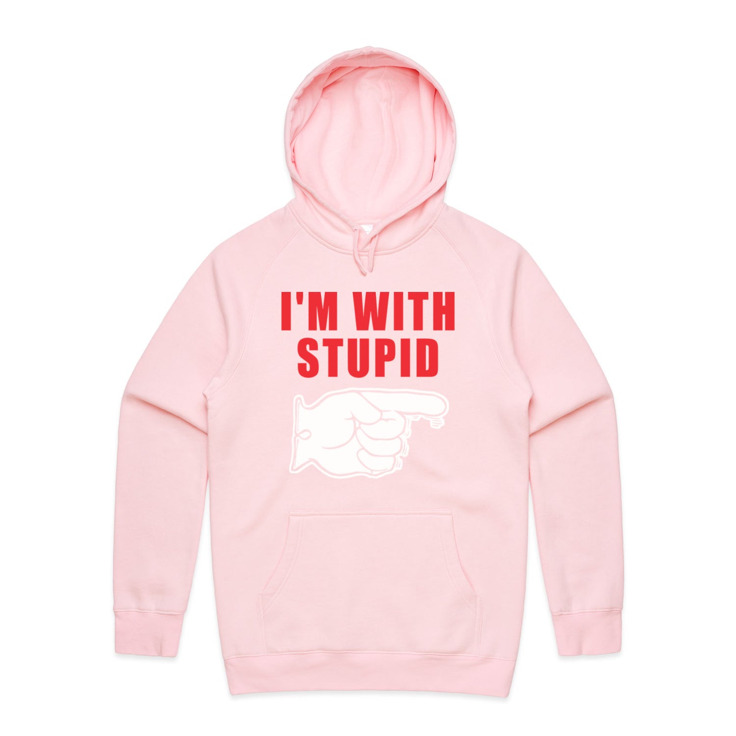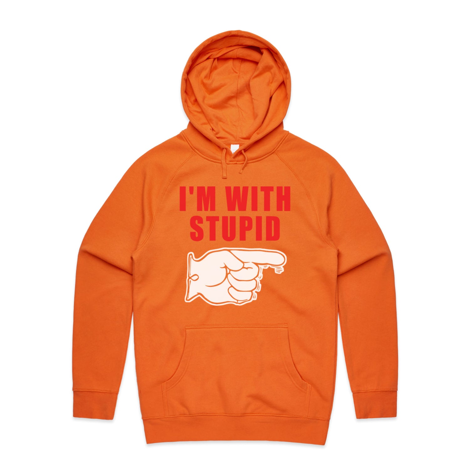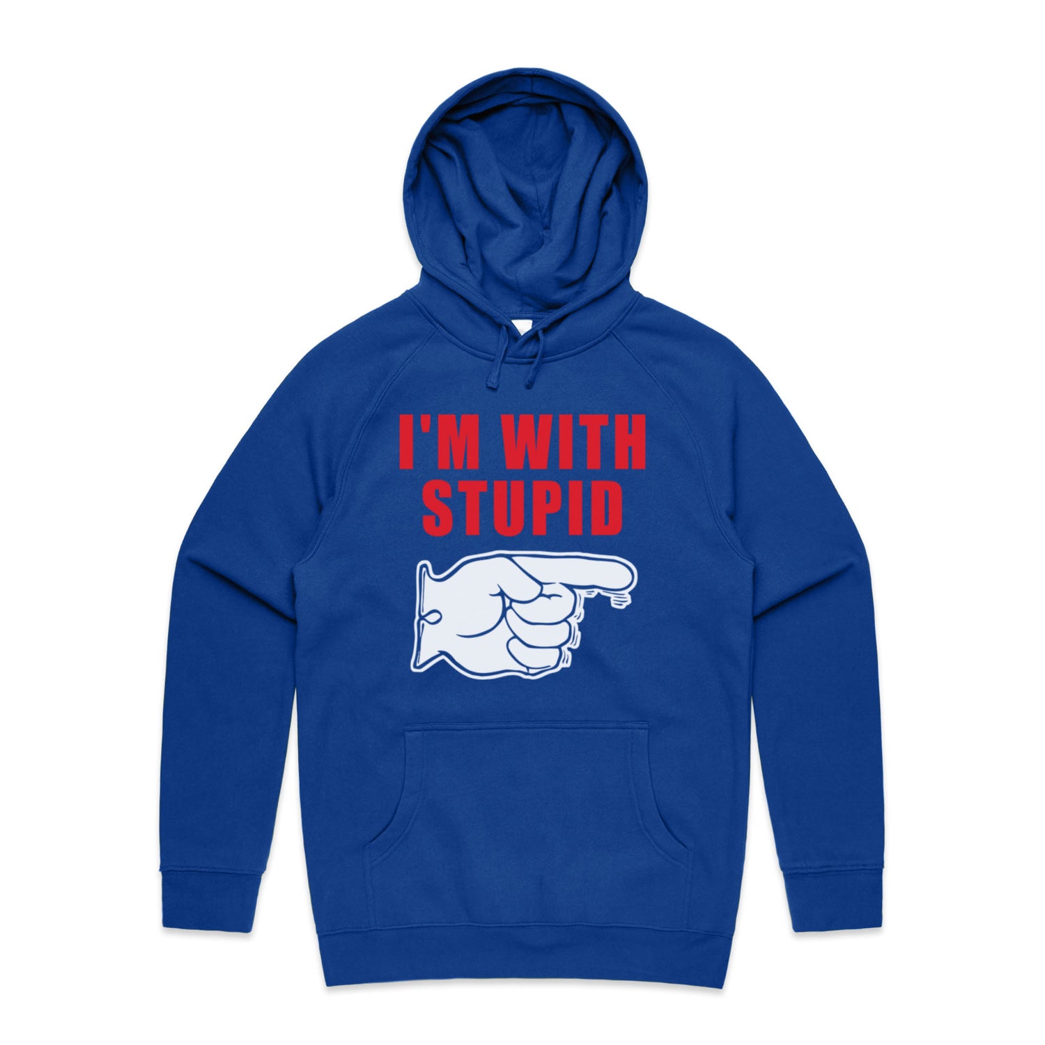 The Hoodies I'm with Stupid – Men's Hooded Sweatshirt is a high-quality men's hooded sweatshirt, printed with multicoloured ink on the trusted AS Colour Supply Hood 5101. With a regular fit and mid-weight feel, it's crafted from a premium blend of 80% cotton and 20% polyester anti-pill fleece, making it a durable and comfortable staple for any wardrobe. The pullover design features raglan sleeves, a lined hood with tonal drawcord, ribbed sleeve cuffs, and a roomy kangaroo pocket — all designed to keep you warm while looking effortlessly sharp.