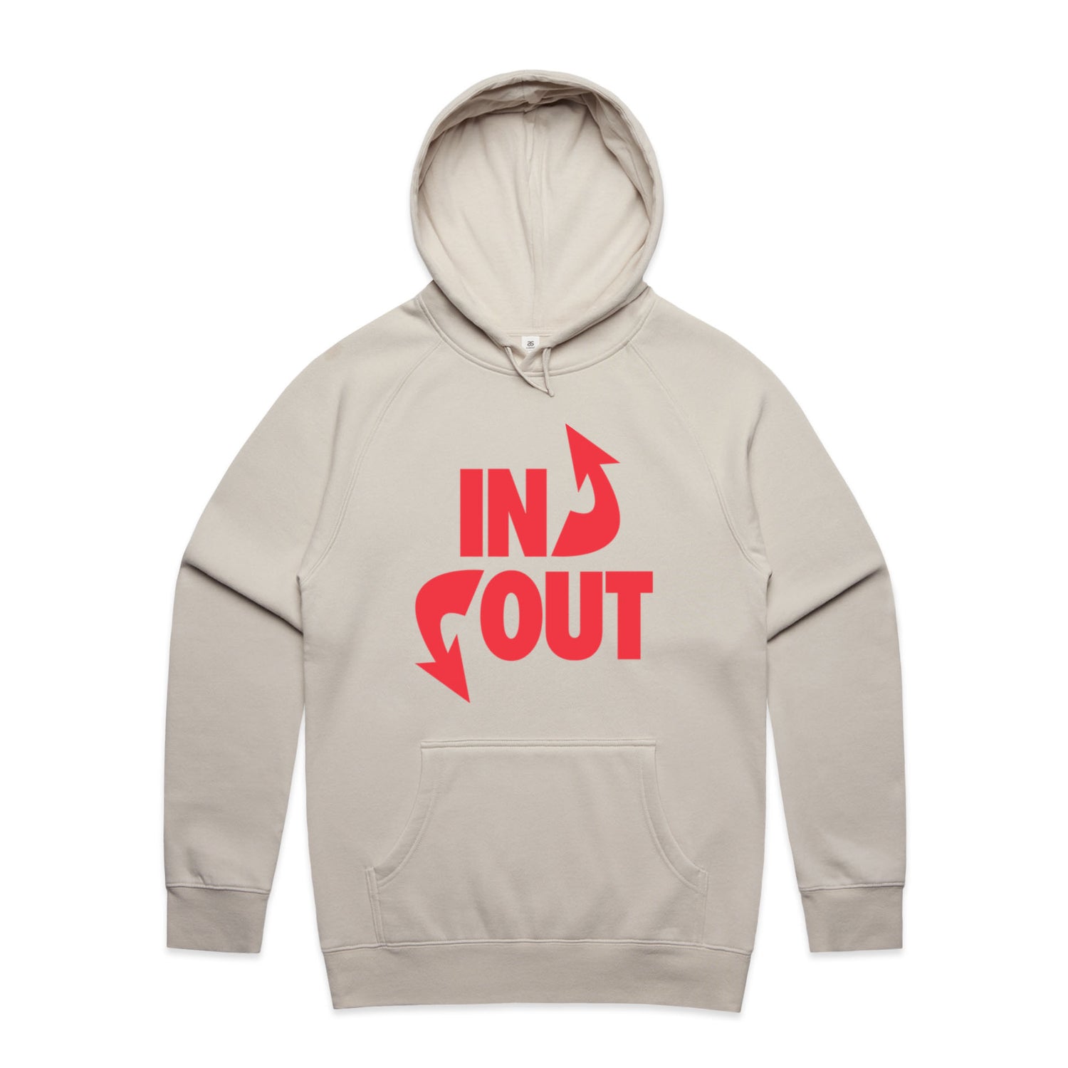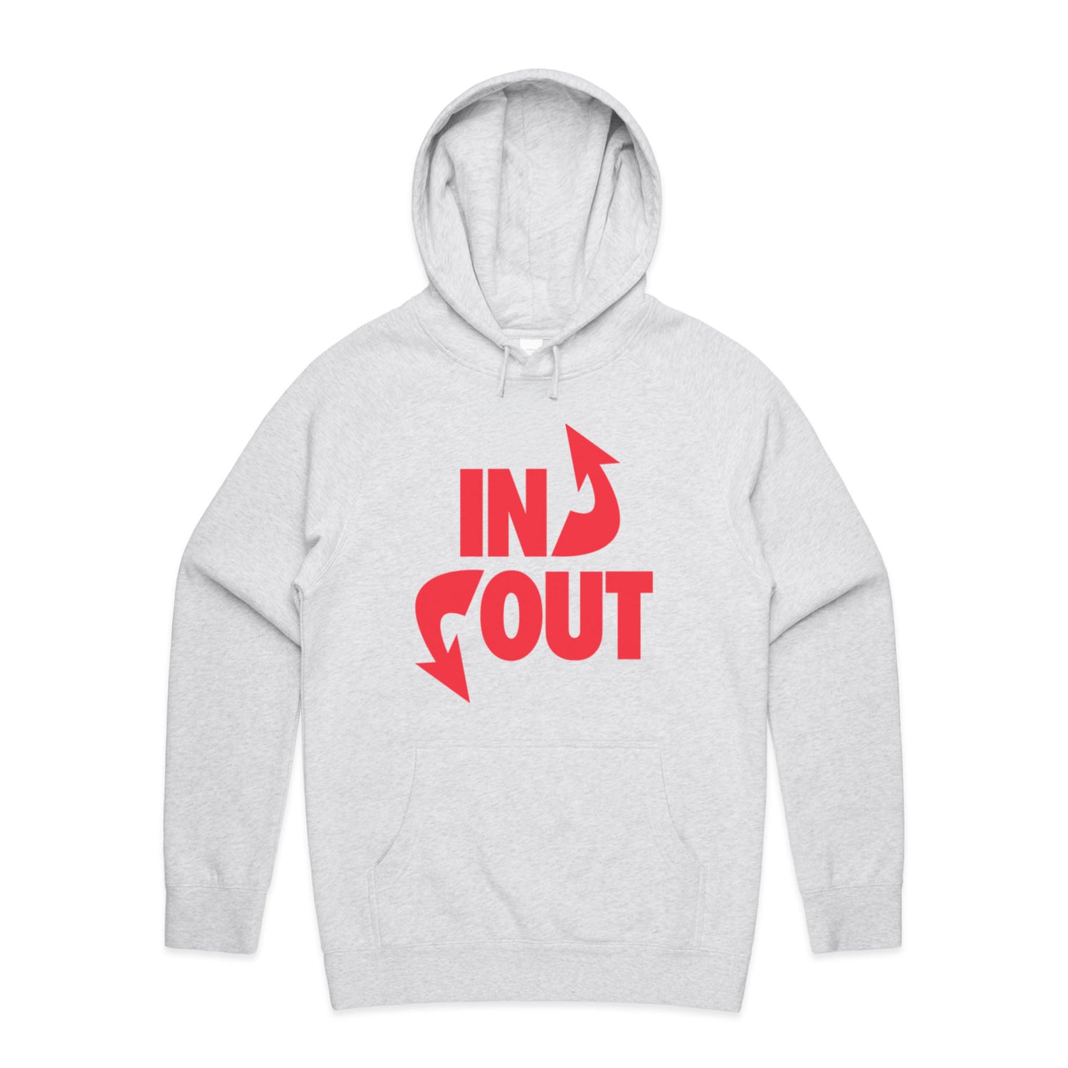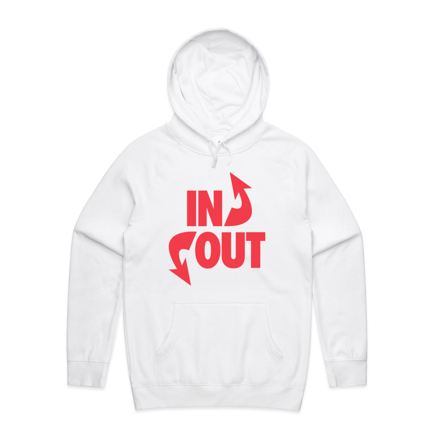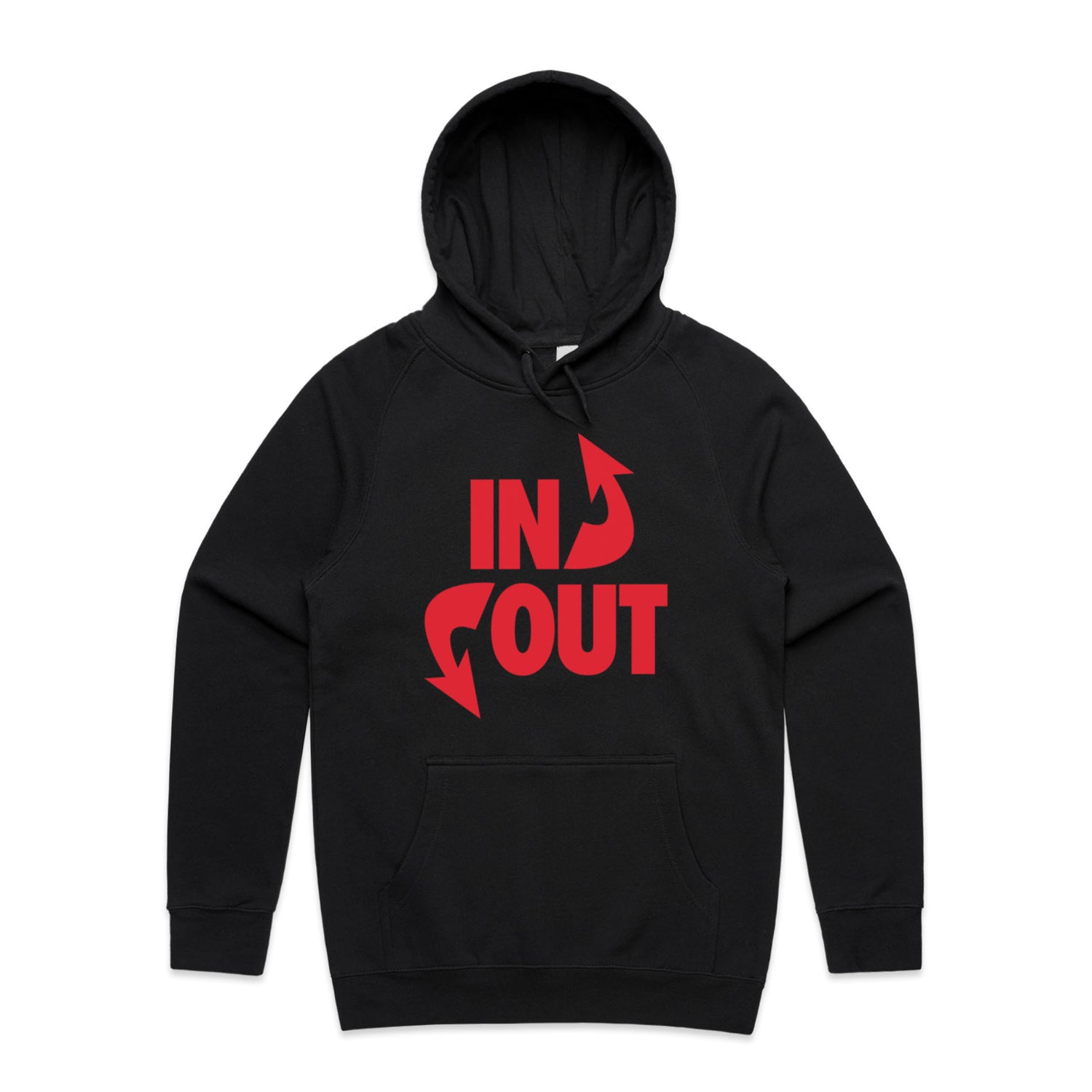 The Hoodies In 'N' Out – Men's Hooded Sweatshirt is a high-quality men's hooded sweatshirt, printed with red ink on the trusted AS Colour Supply Hood 5101. With a regular fit and mid-weight feel, it's crafted from a premium blend of 80% cotton and 20% polyester anti-pill fleece, making it a durable and comfortable staple for any wardrobe. The pullover design features raglan sleeves, a lined hood with tonal drawcord, ribbed sleeve cuffs, and a roomy kangaroo pocket — all designed to keep you warm while looking effortlessly sharp.