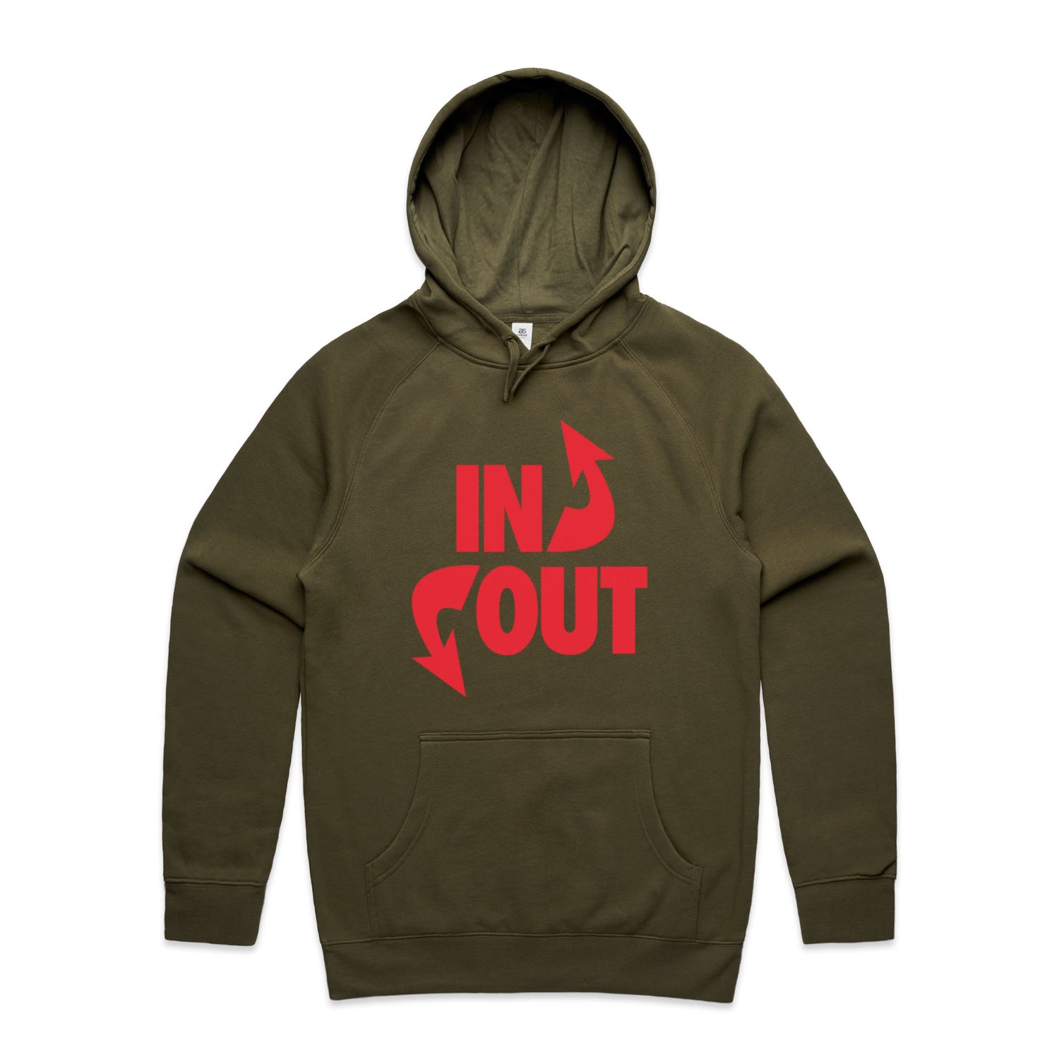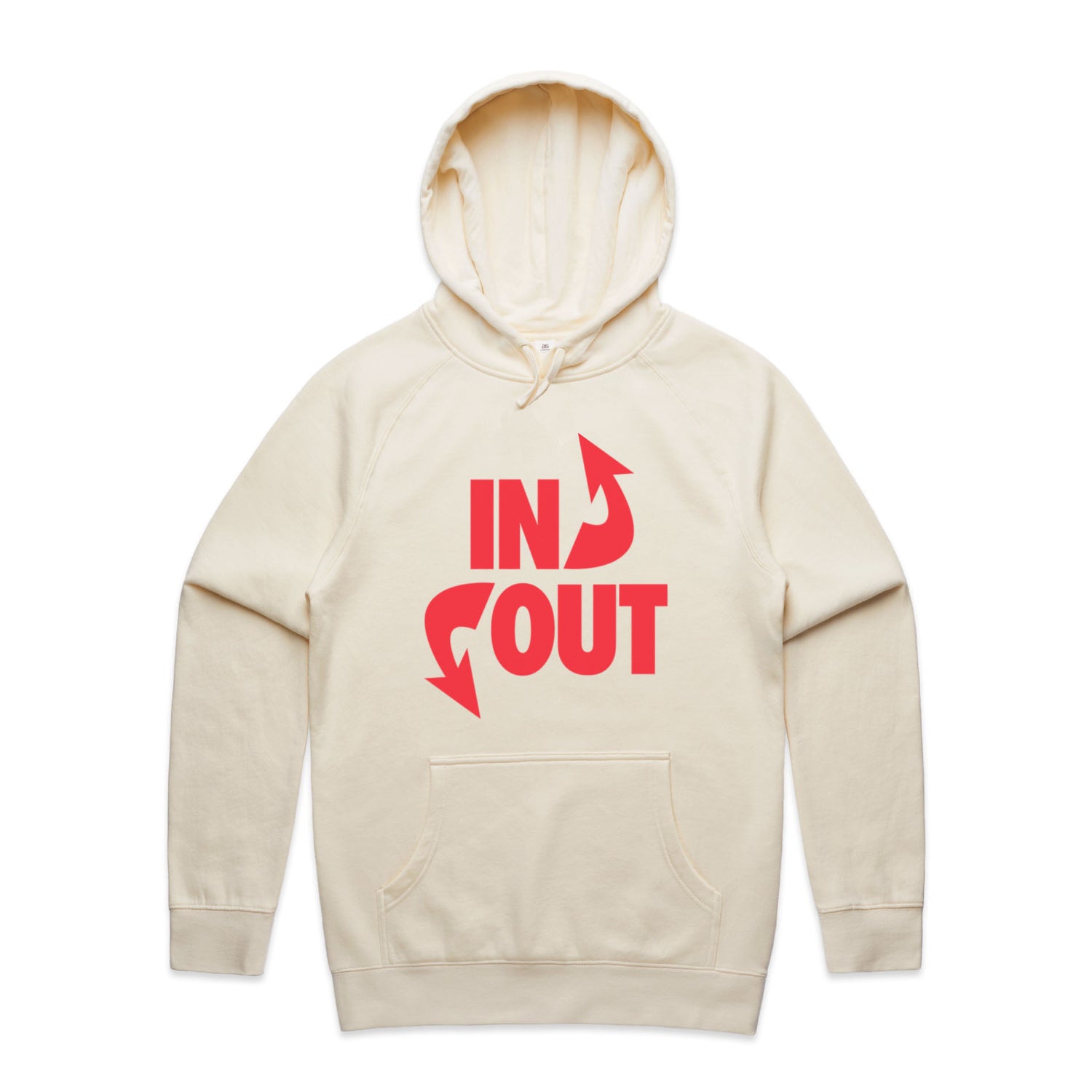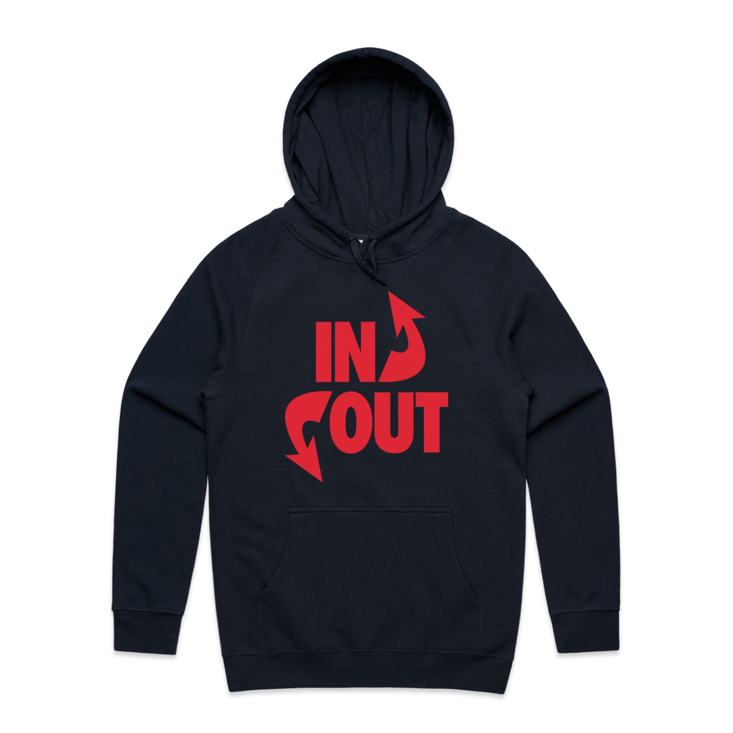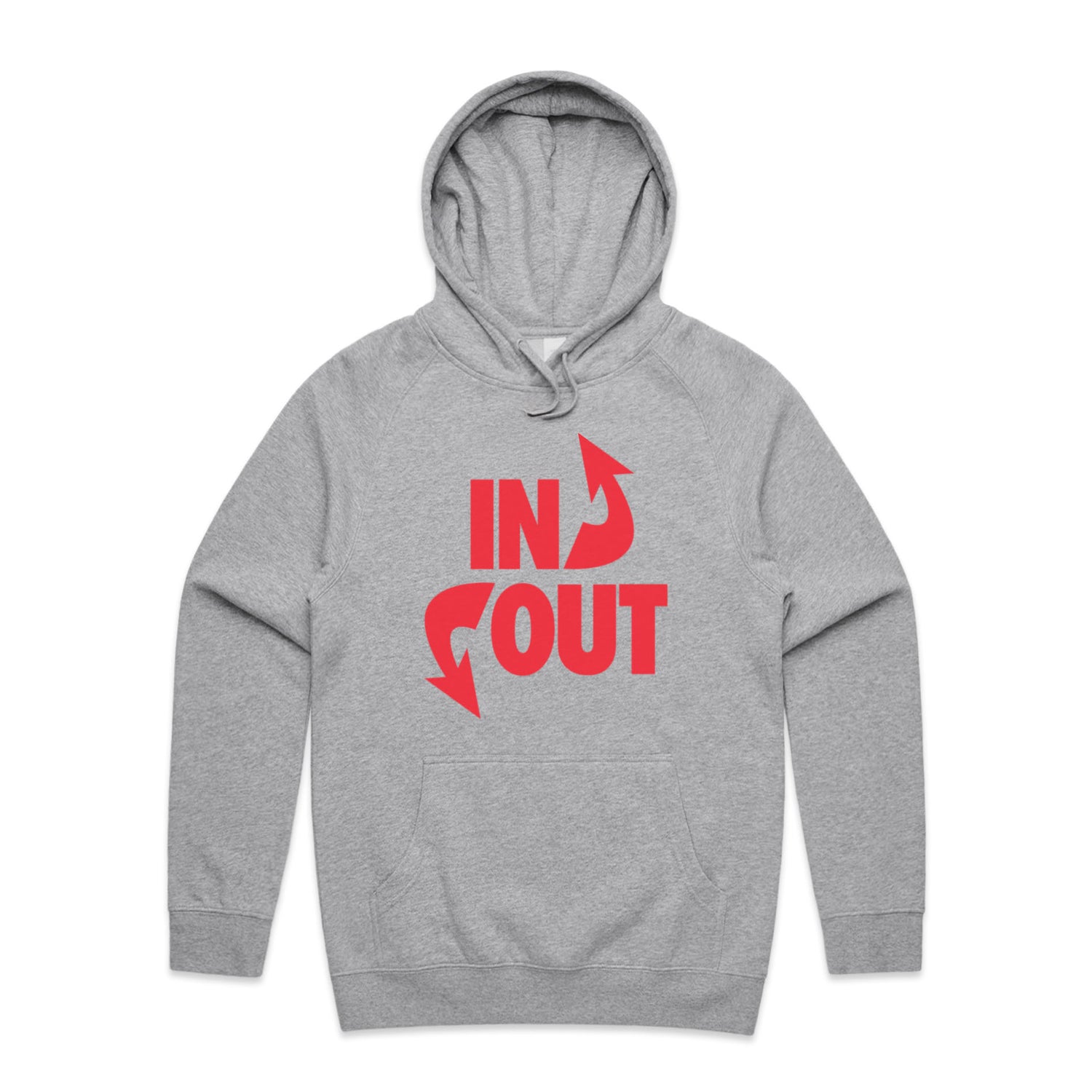 The Hoodies In 'N' Out – Men's Hooded Sweatshirt is a high-quality men's hooded sweatshirt, printed with red ink on the trusted AS Colour Supply Hood 5101. With a regular fit and mid-weight feel, it's crafted from a premium blend of 80% cotton and 20% polyester anti-pill fleece, making it a durable and comfortable staple for any wardrobe. The pullover design features raglan sleeves, a lined hood with tonal drawcord, ribbed sleeve cuffs, and a roomy kangaroo pocket — all designed to keep you warm while looking effortlessly sharp.