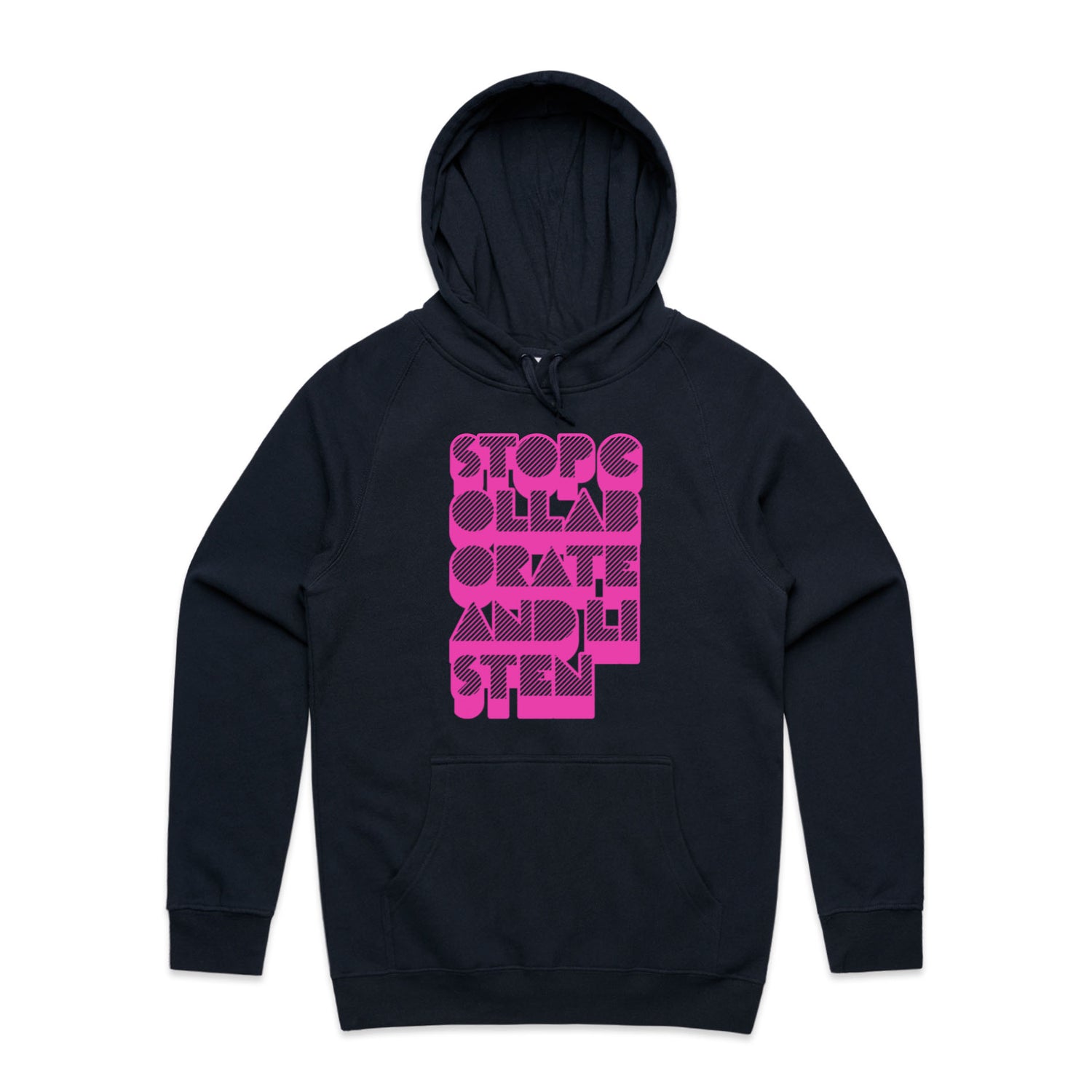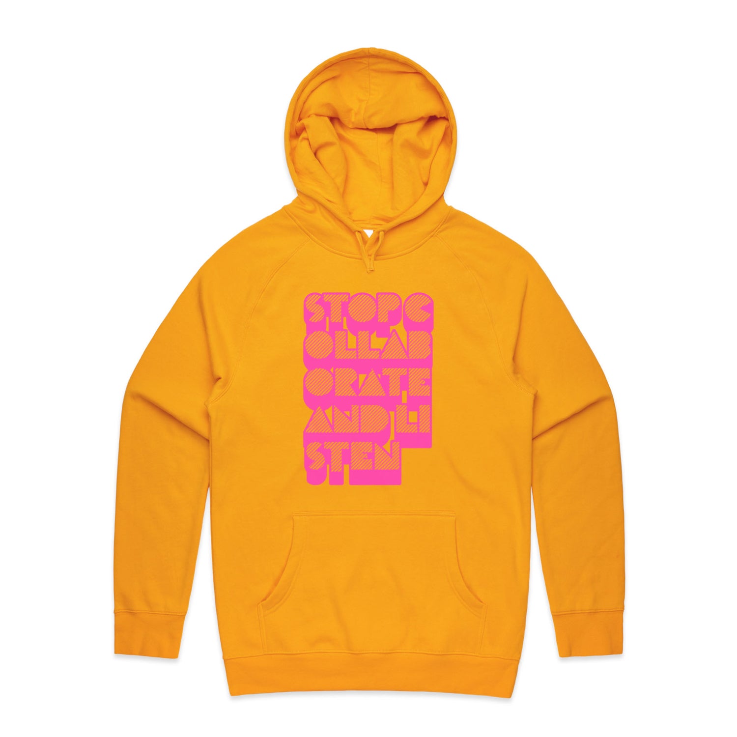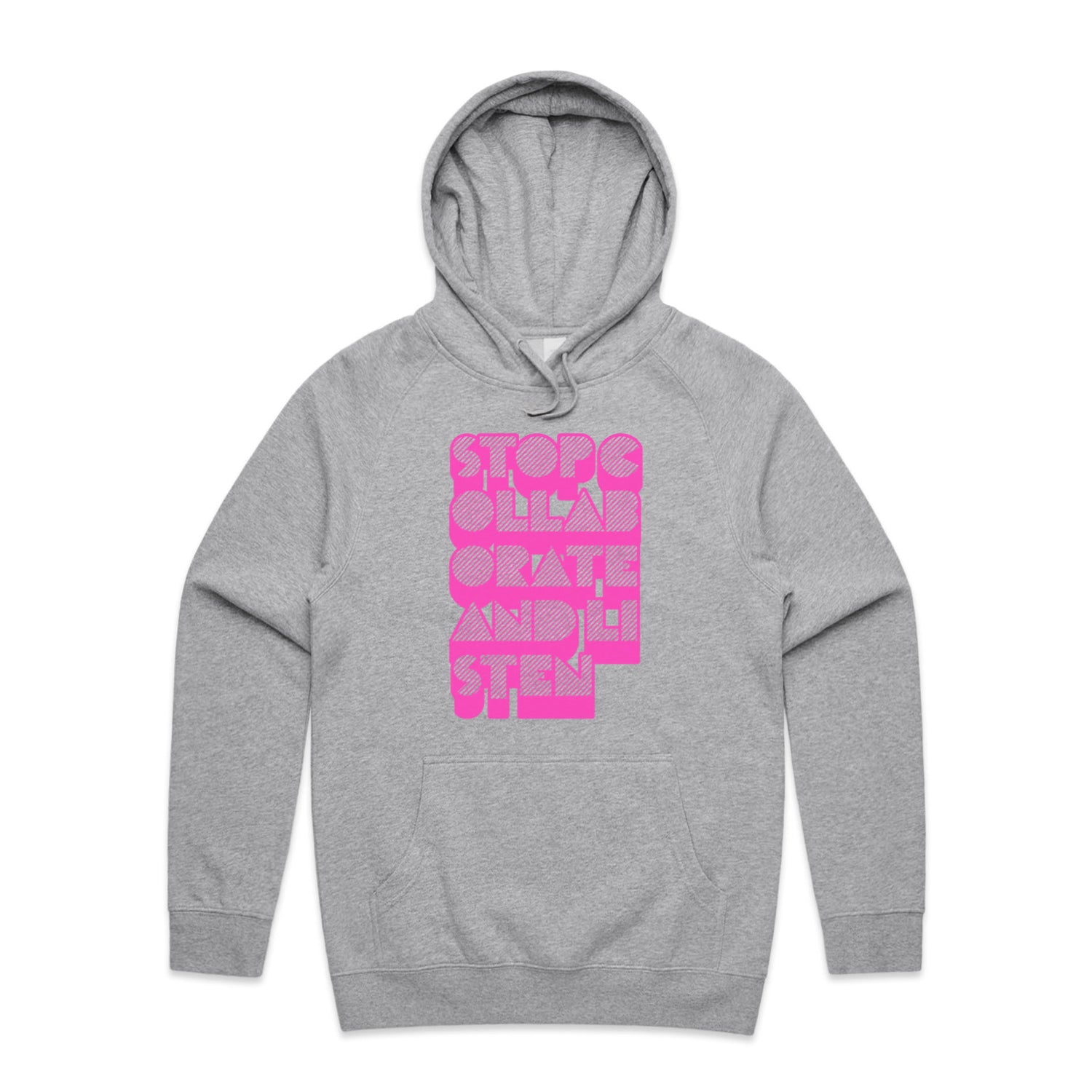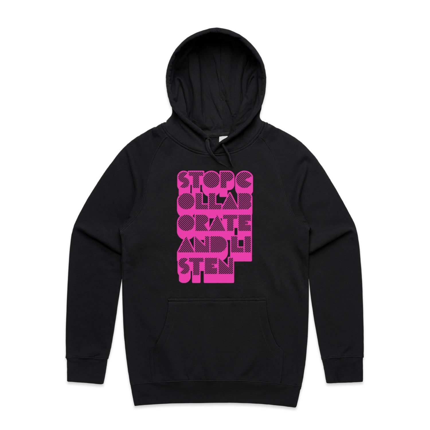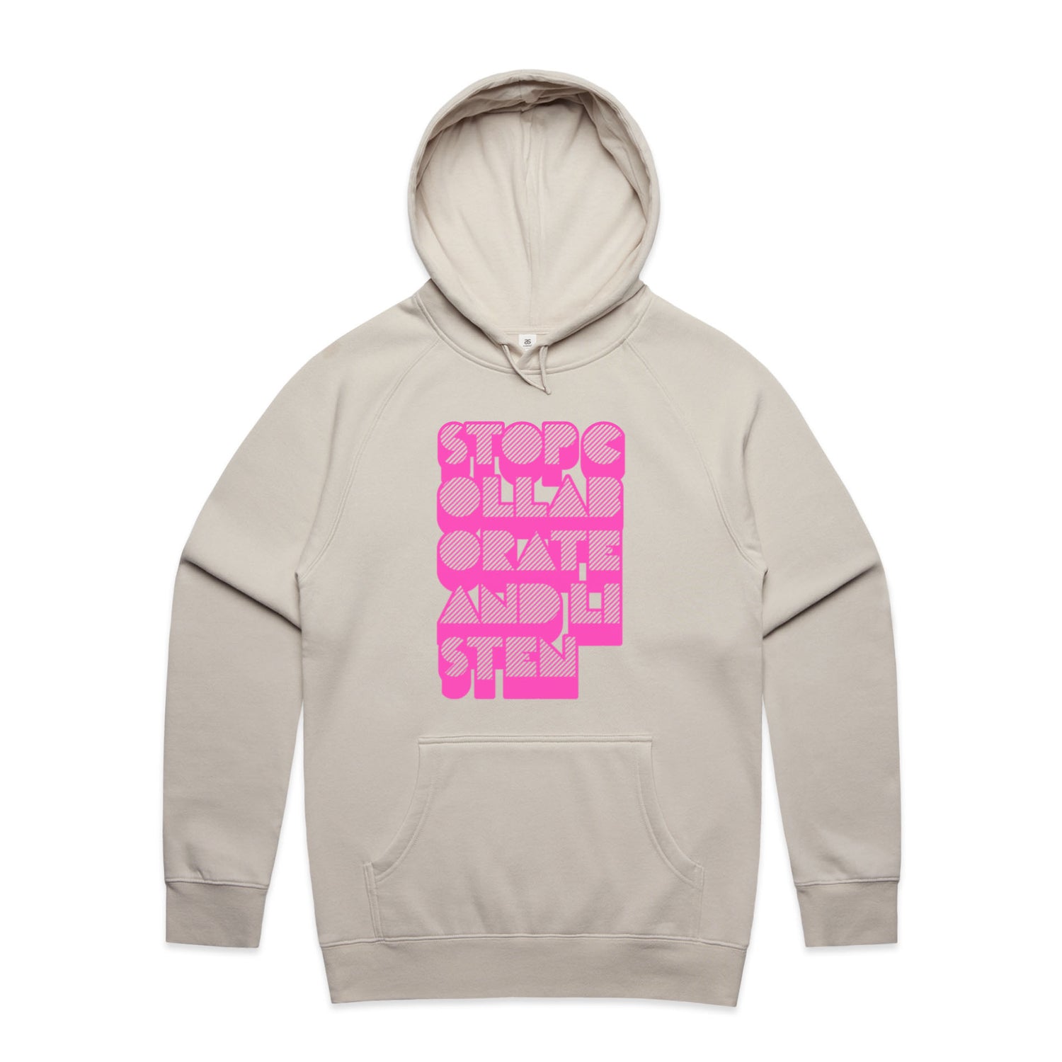 The Hoodies Stop Collaborate Listen – Men's Hooded Sweatshirt is a high-quality men's hooded sweatshirt, printed with fluoro pink ink on the trusted AS Colour Supply Hood 5101. With a regular fit and mid-weight feel, it's crafted from a premium blend of 80% cotton and 20% polyester anti-pill fleece, making it a durable and comfortable staple for any wardrobe. The pullover design features raglan sleeves, a lined hood with tonal drawcord, ribbed sleeve cuffs, and a roomy kangaroo pocket — all designed to keep you warm while looking effortlessly sharp.