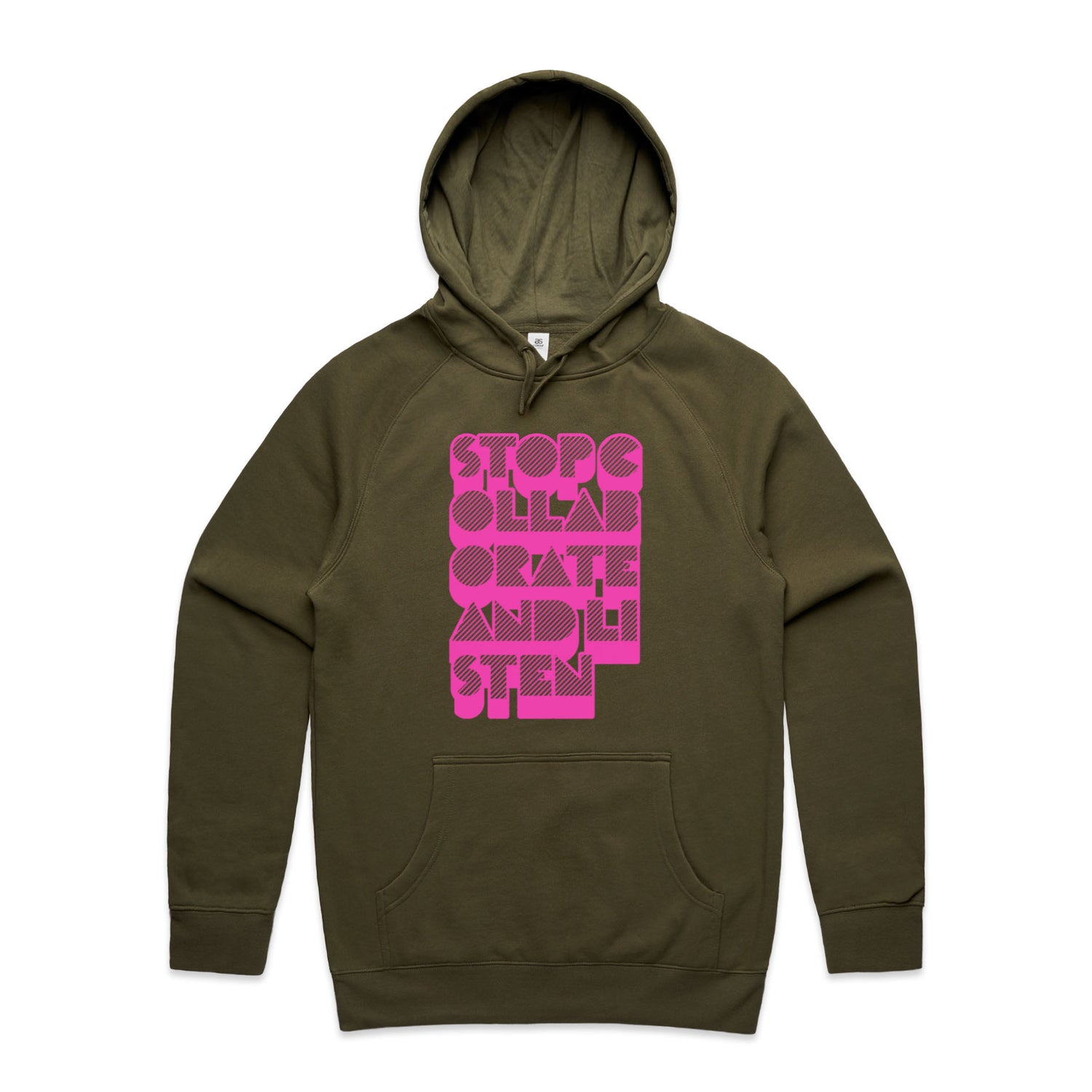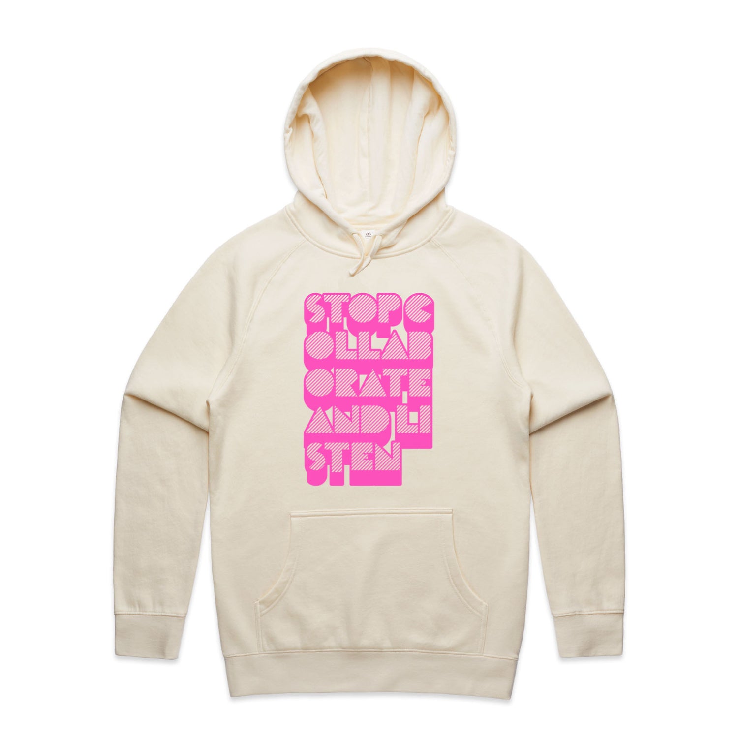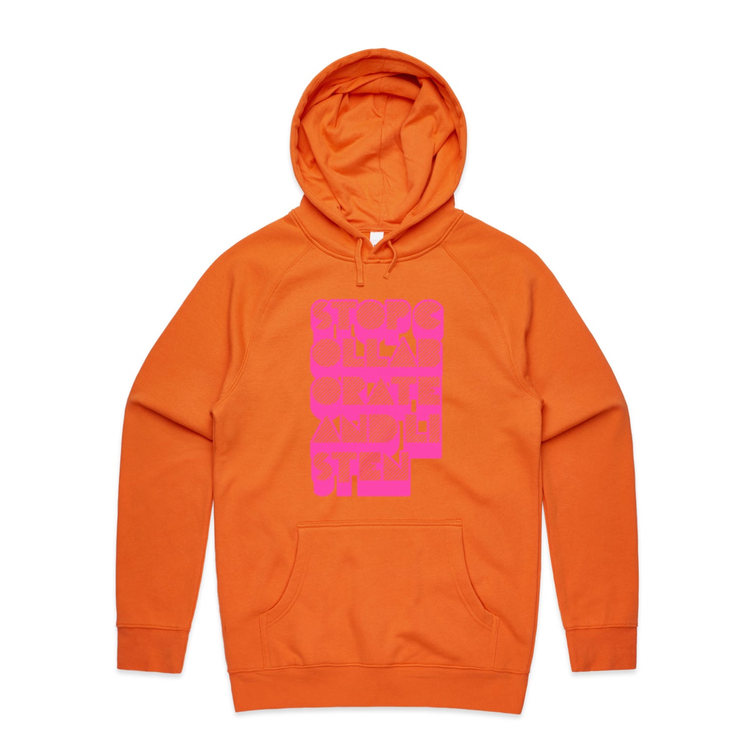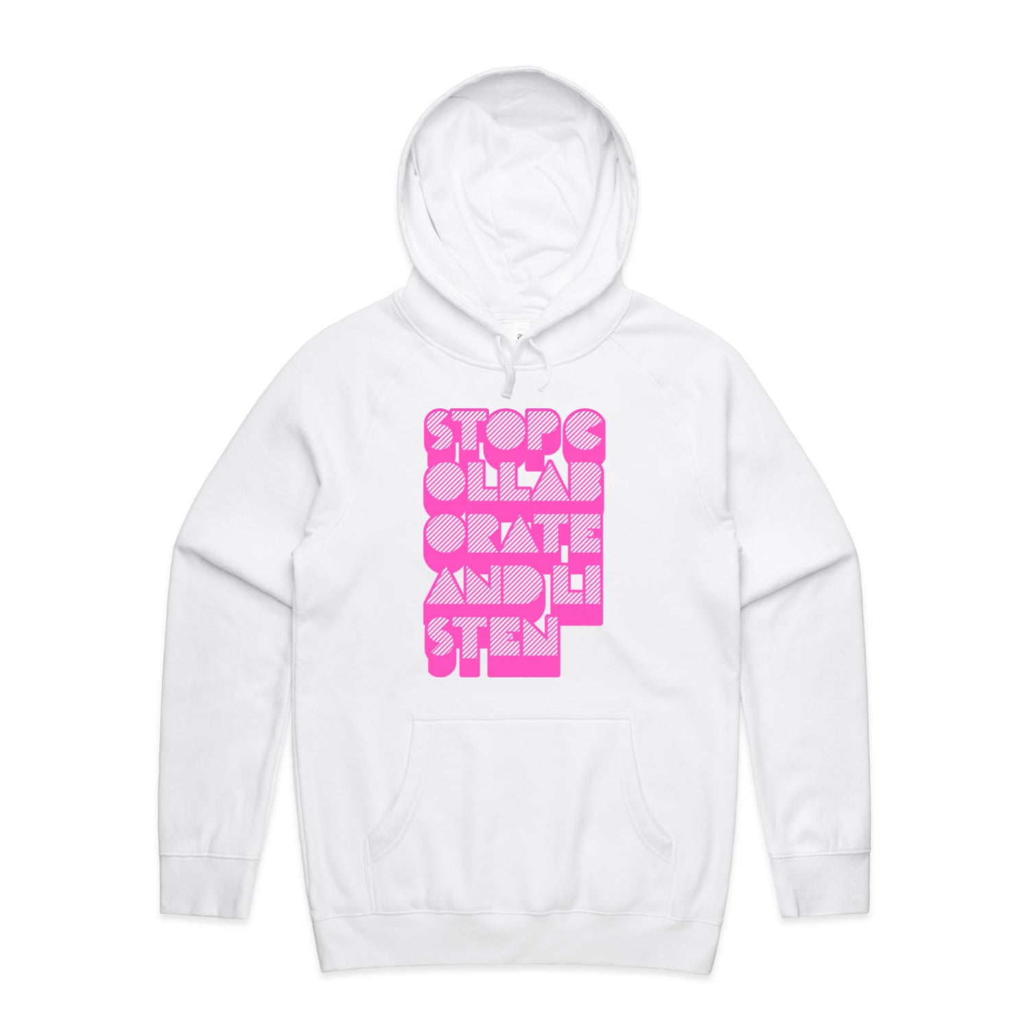 The Hoodies Stop Collaborate Listen – Men's Hooded Sweatshirt is a high-quality men's hooded sweatshirt, printed with fluoro pink ink on the trusted AS Colour Supply Hood 5101. With a regular fit and mid-weight feel, it's crafted from a premium blend of 80% cotton and 20% polyester anti-pill fleece, making it a durable and comfortable staple for any wardrobe. The pullover design features raglan sleeves, a lined hood with tonal drawcord, ribbed sleeve cuffs, and a roomy kangaroo pocket — all designed to keep you warm while looking effortlessly sharp.