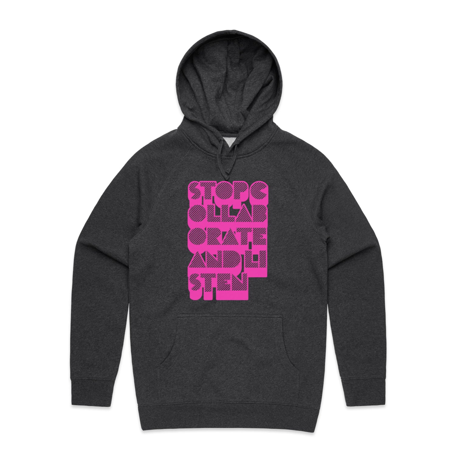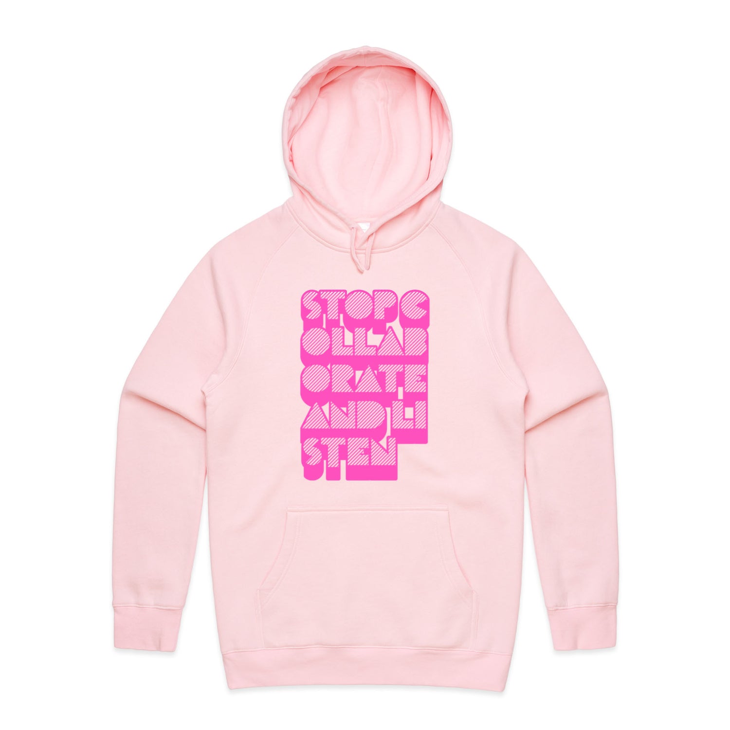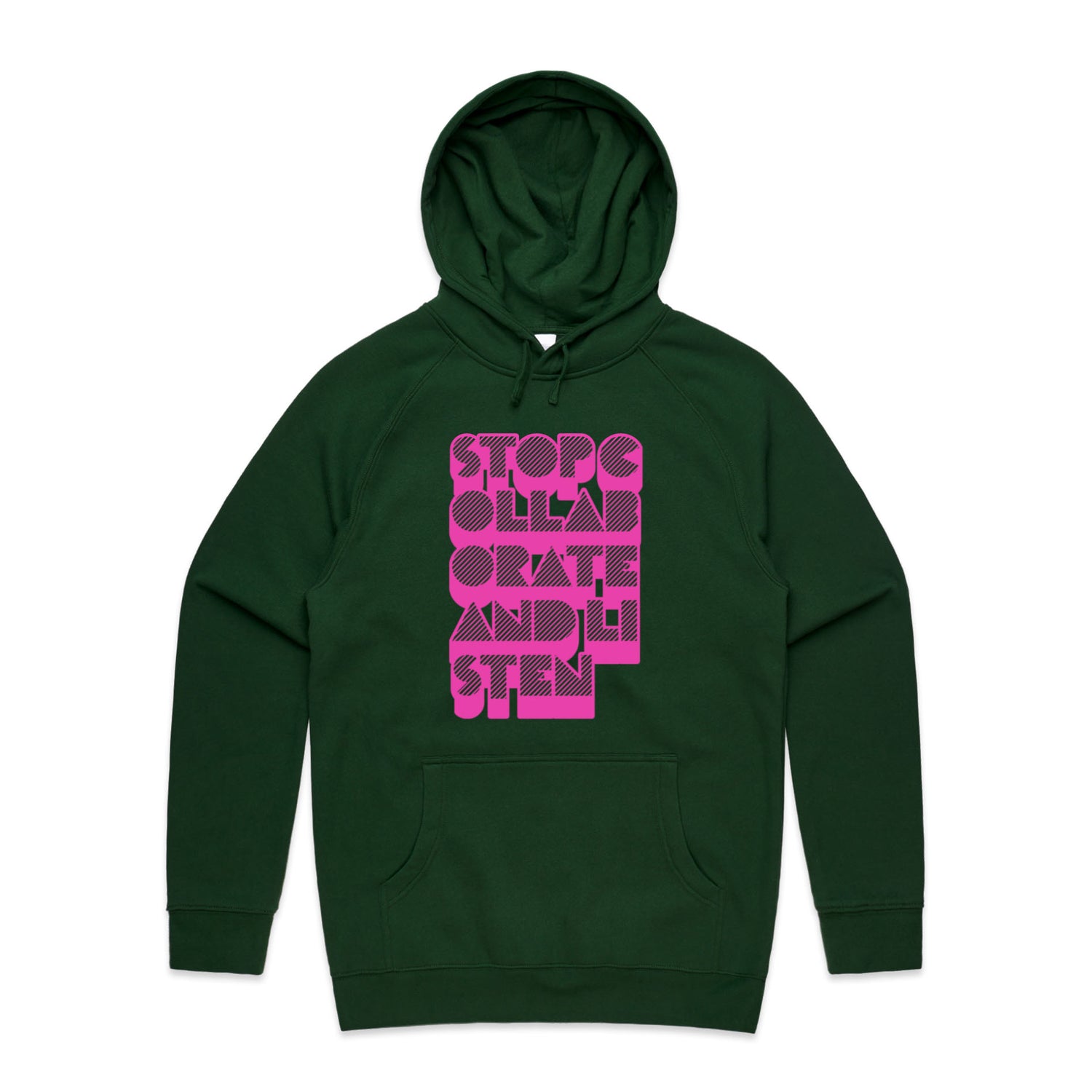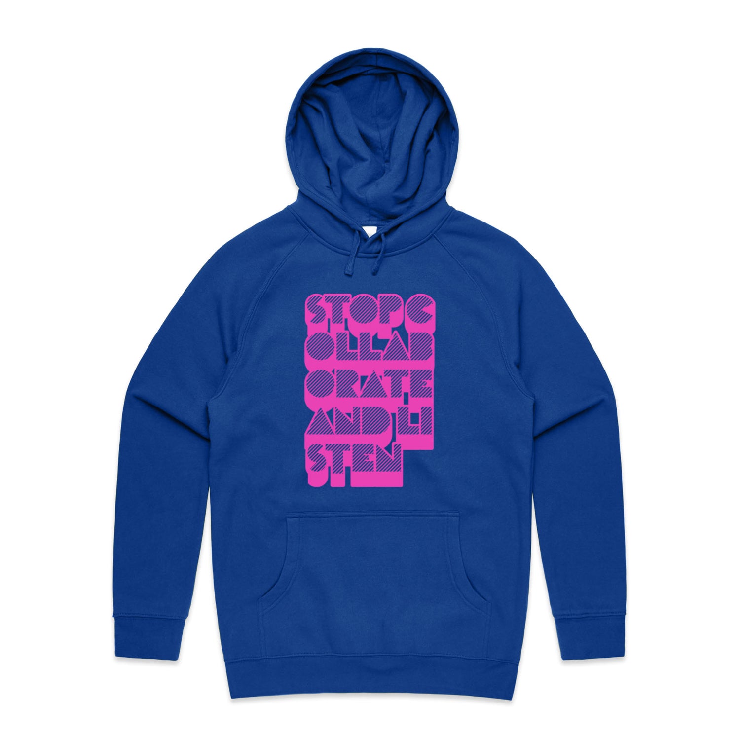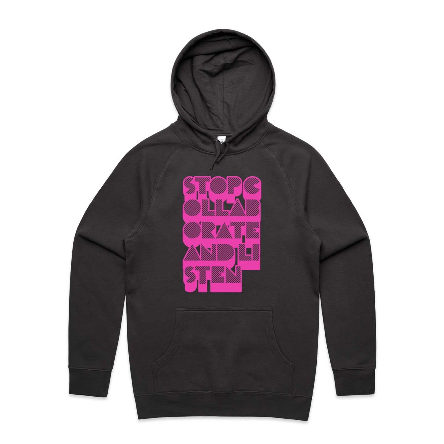 The Hoodies Stop Collaborate Listen – Men's Hooded Sweatshirt is a high-quality men's hooded sweatshirt, printed with fluoro pink ink on the trusted AS Colour Supply Hood 5101. With a regular fit and mid-weight feel, it's crafted from a premium blend of 80% cotton and 20% polyester anti-pill fleece, making it a durable and comfortable staple for any wardrobe. The pullover design features raglan sleeves, a lined hood with tonal drawcord, ribbed sleeve cuffs, and a roomy kangaroo pocket — all designed to keep you warm while looking effortlessly sharp.